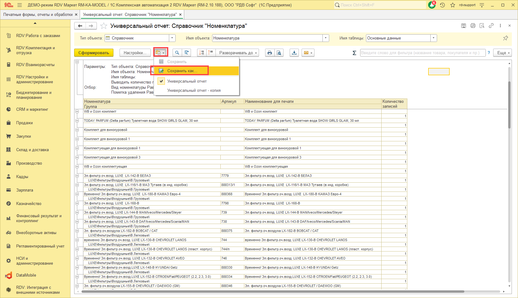 В данном отчете указано только 3 выбранных ранее колонки: Номенклатура, Артикул, Наименование для печати