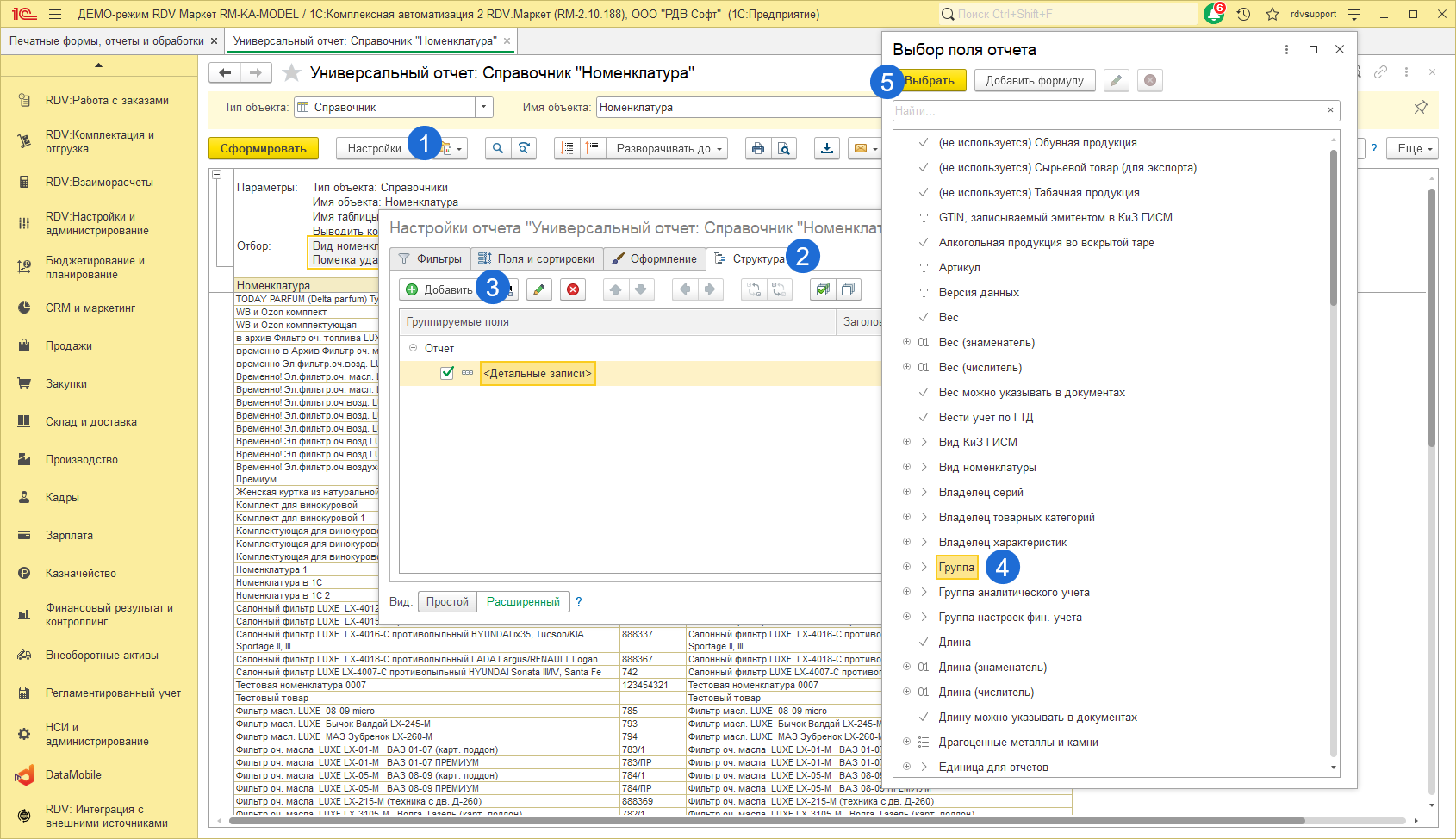 В Настройках (1) отчета в разделе Структура (2) можно выбрать какие строки необходимо видеть в отчете по кнопке Добавить (3) и выбрав необходимые данные, указанные в номенклатуре. Например, в данном случае Группа (4).