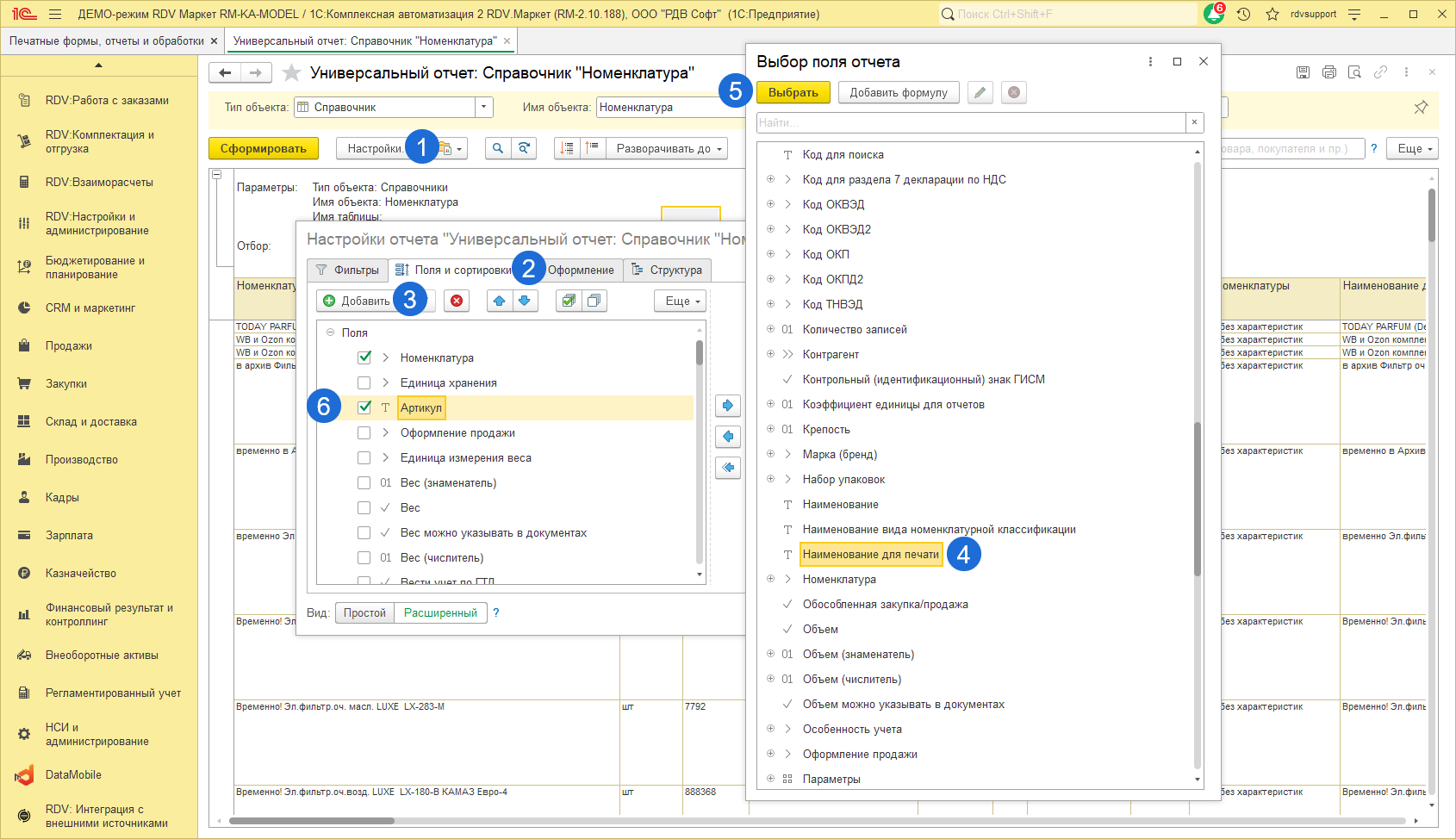 Добавить выбранное поле Наименование для печати в список всех полей по кнопке Выбор (5) и отметив галочками другие необходимые поля (6) можно сформировать отчет с необходимыми колонками.