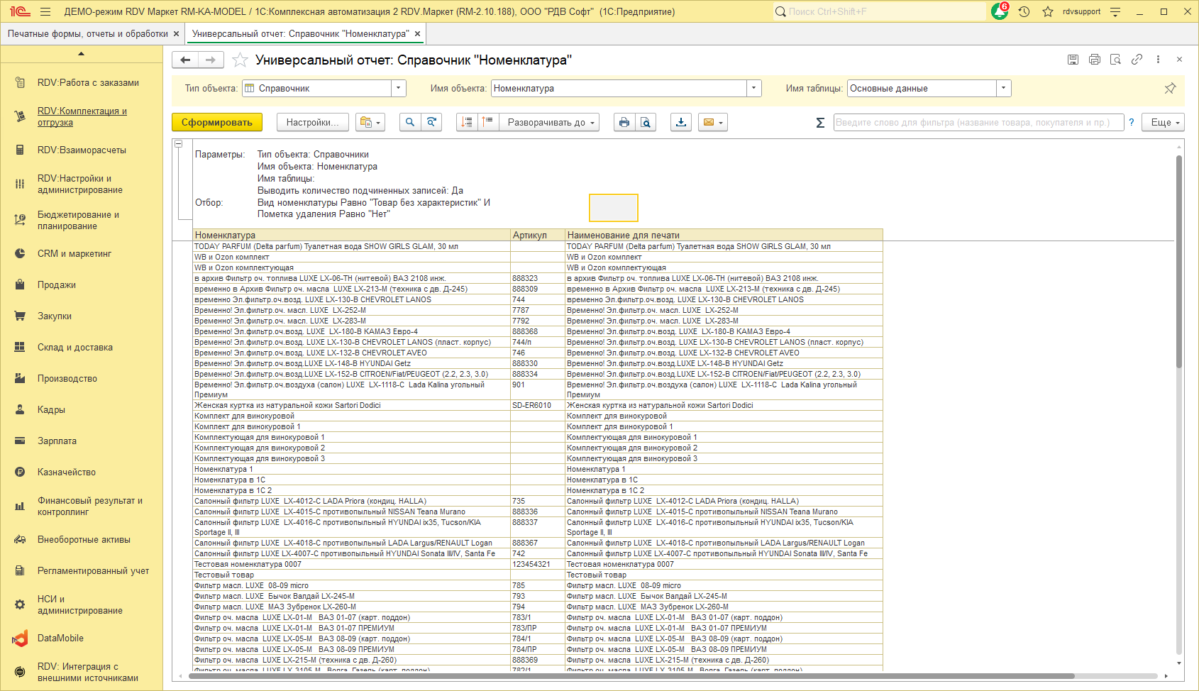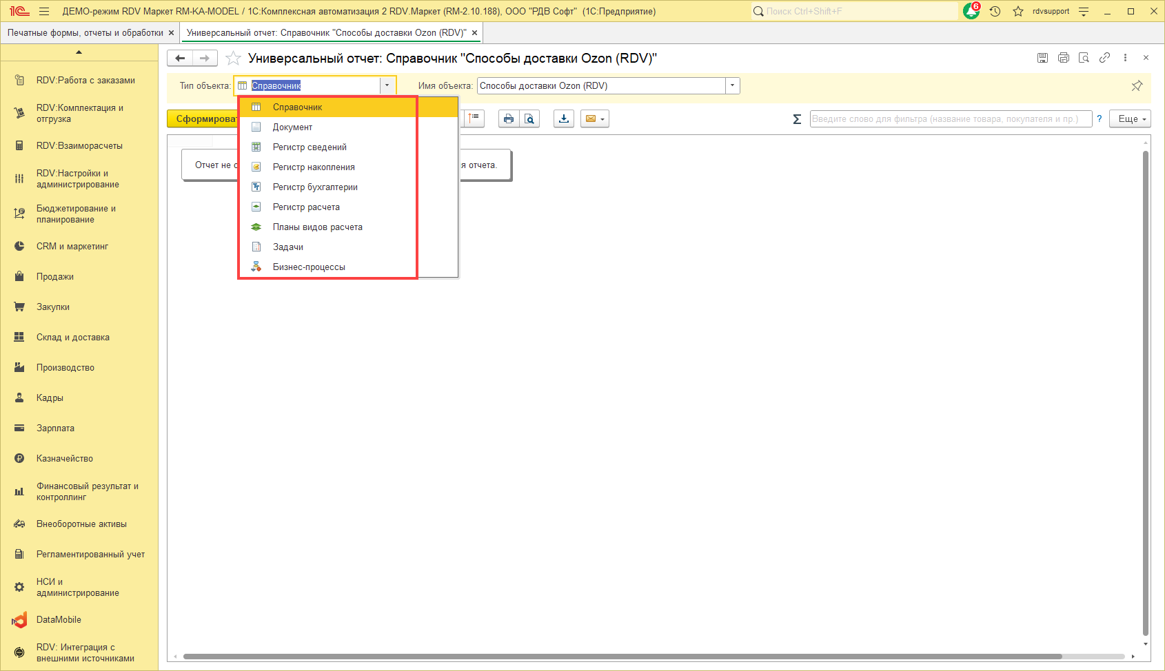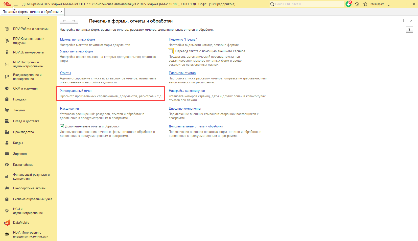 Данный отчет находится в разделе "НСИ и администрирование" - "Печатные формы отчеты и обработки" - "Универсальный отчет"