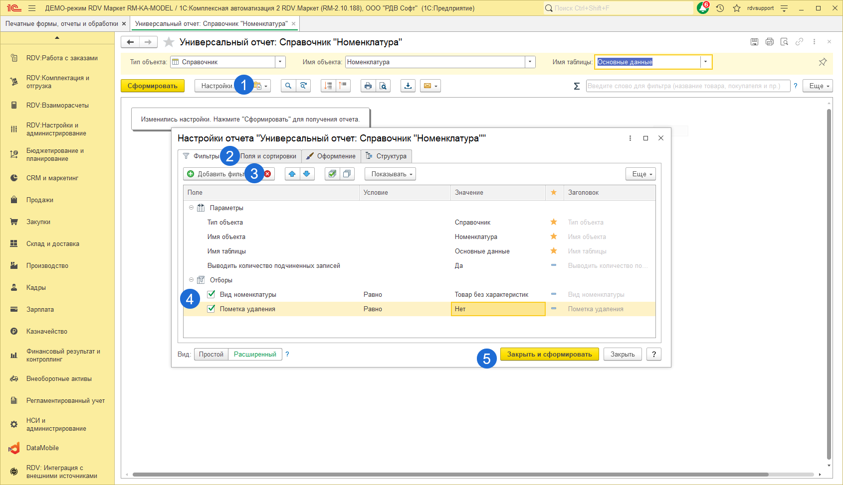 После завершения настроек можно сформировать отчет по кнопке Закрыть и сформировать (5)