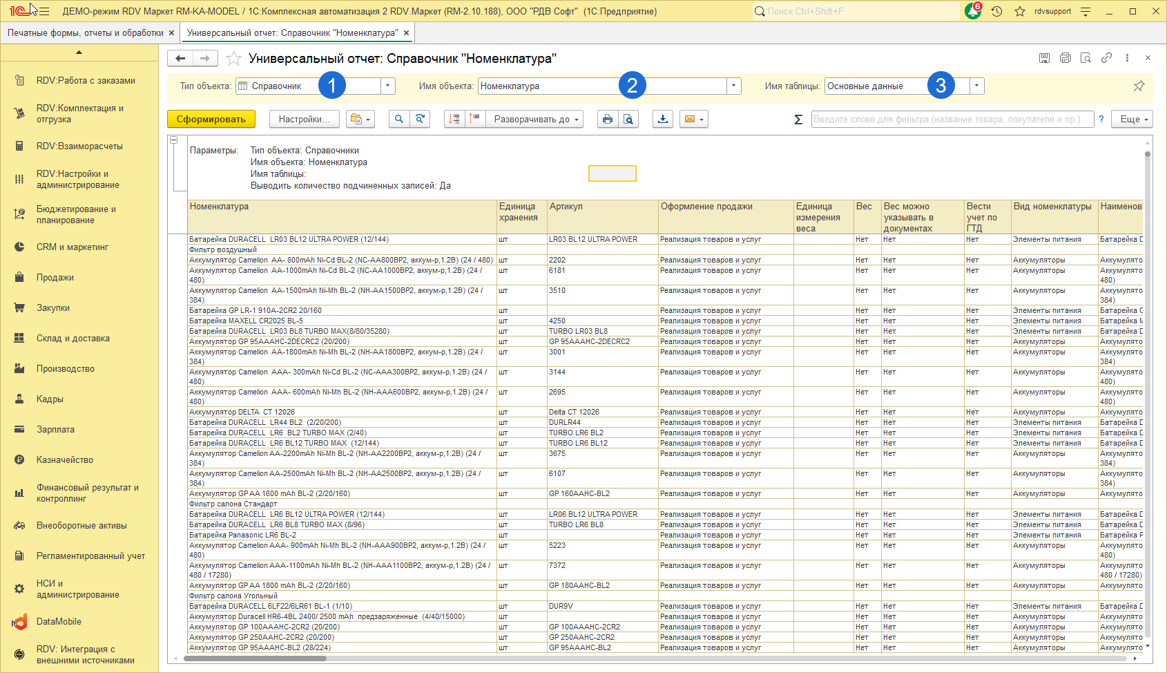 Для того чтобы массово выгрузить все необходимые данные из 1С можно воспользоваться универсальным отчетом.