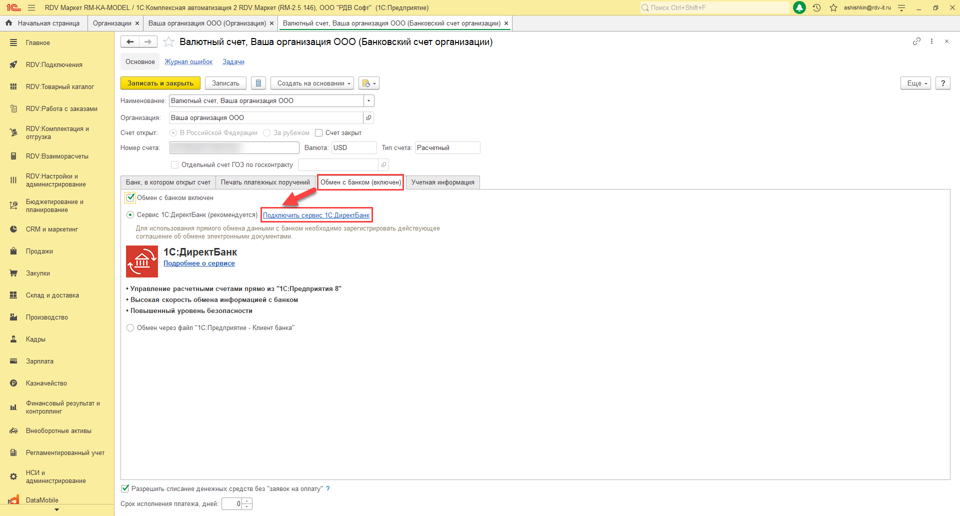 При добавлении нового банковского счета пользователь сразу же может настроить прямой обмен с банком по ссылке "Подключить сервис 1С: ДиректБанк" на вкладке "Обмен с банками":