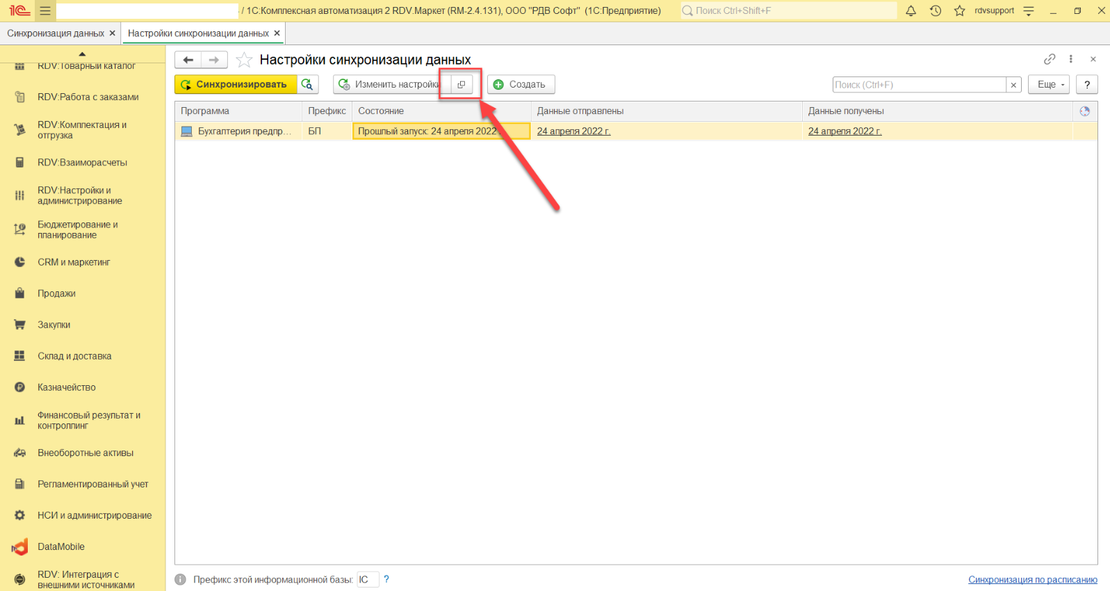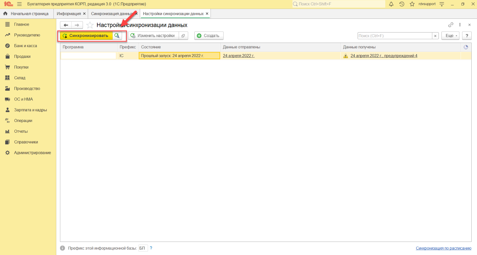 После завершения настройки синхронизации в КА, выполнить первоначальную выгрузку согласно установленным настройкам. Синхронизация запускается в базе БП по кнопке "Синхронизировать":