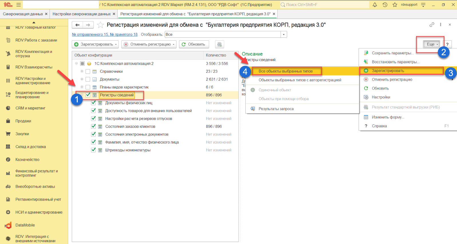 Если при первоначальной выгрузке зарегистрировано большое количество объектов (15-20 тысяч), то синхронизация может не пройти. В данном случае рекомендуется выполнить ручную регистрацию объектов и последовательную выгрузку в КА, в следующем порядке: