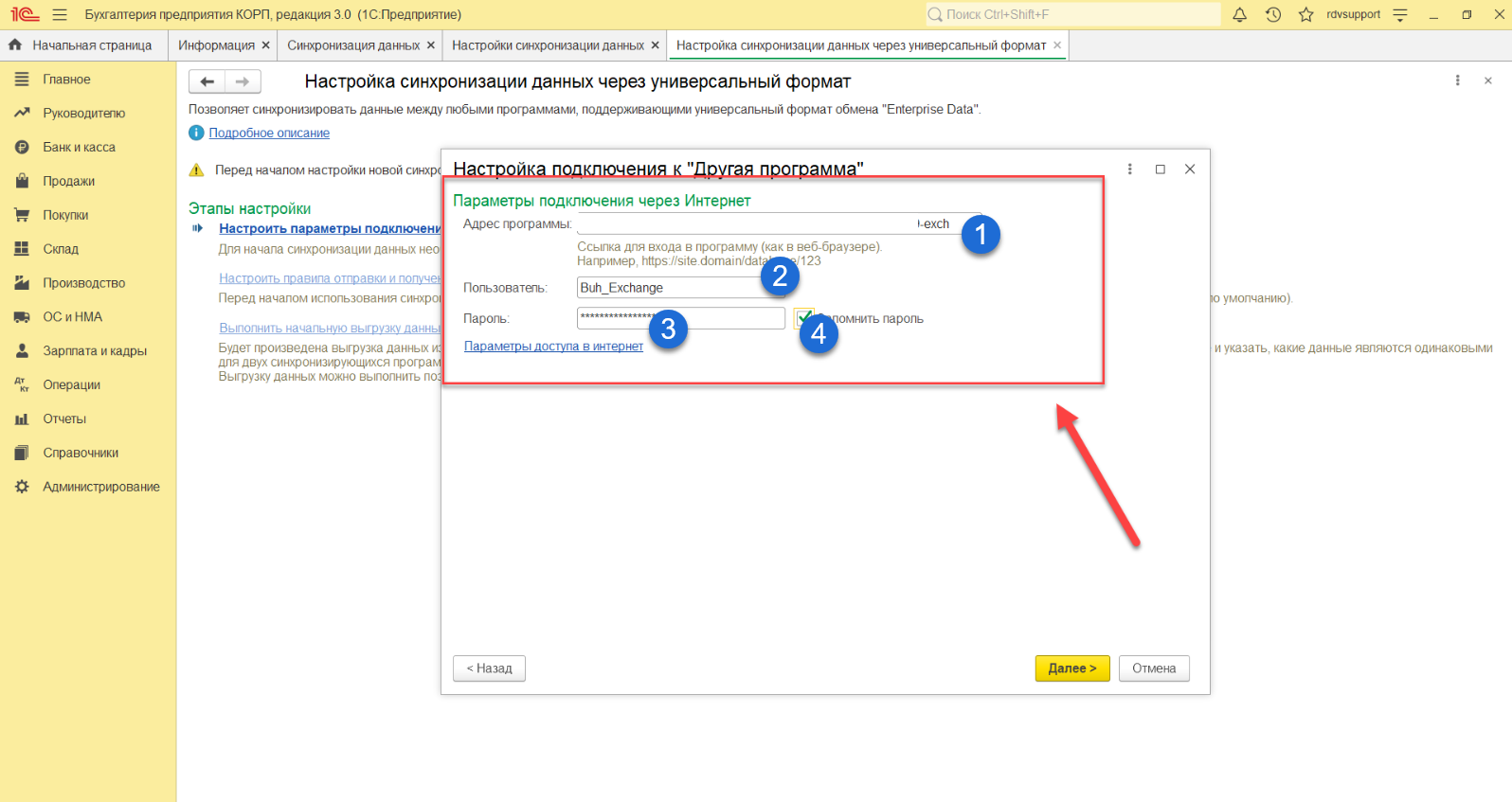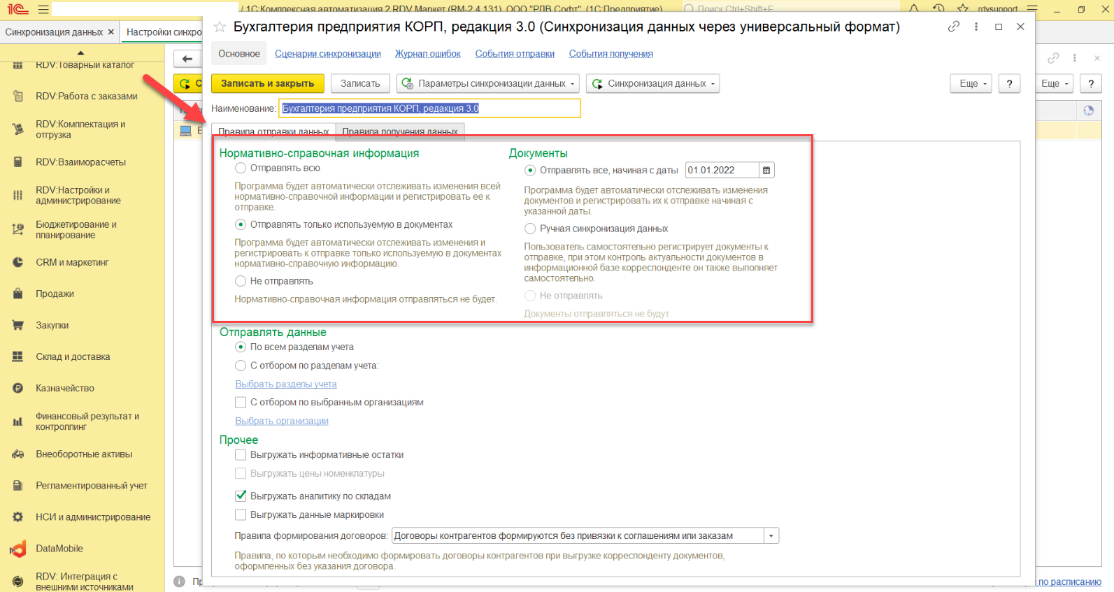 - Установить флажок "Синхронизация данных"
