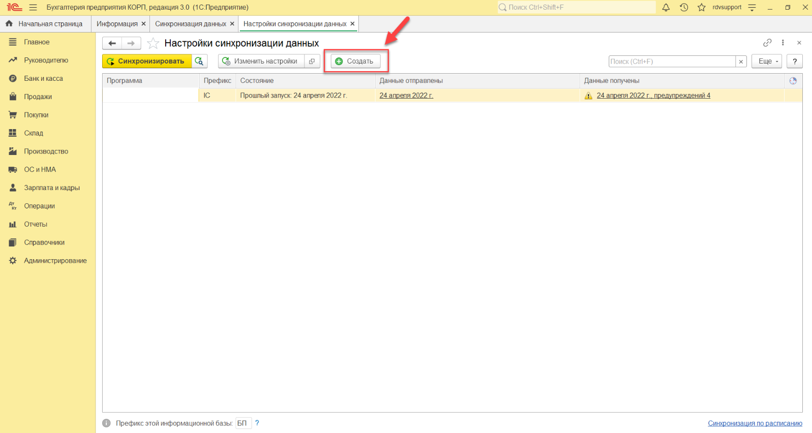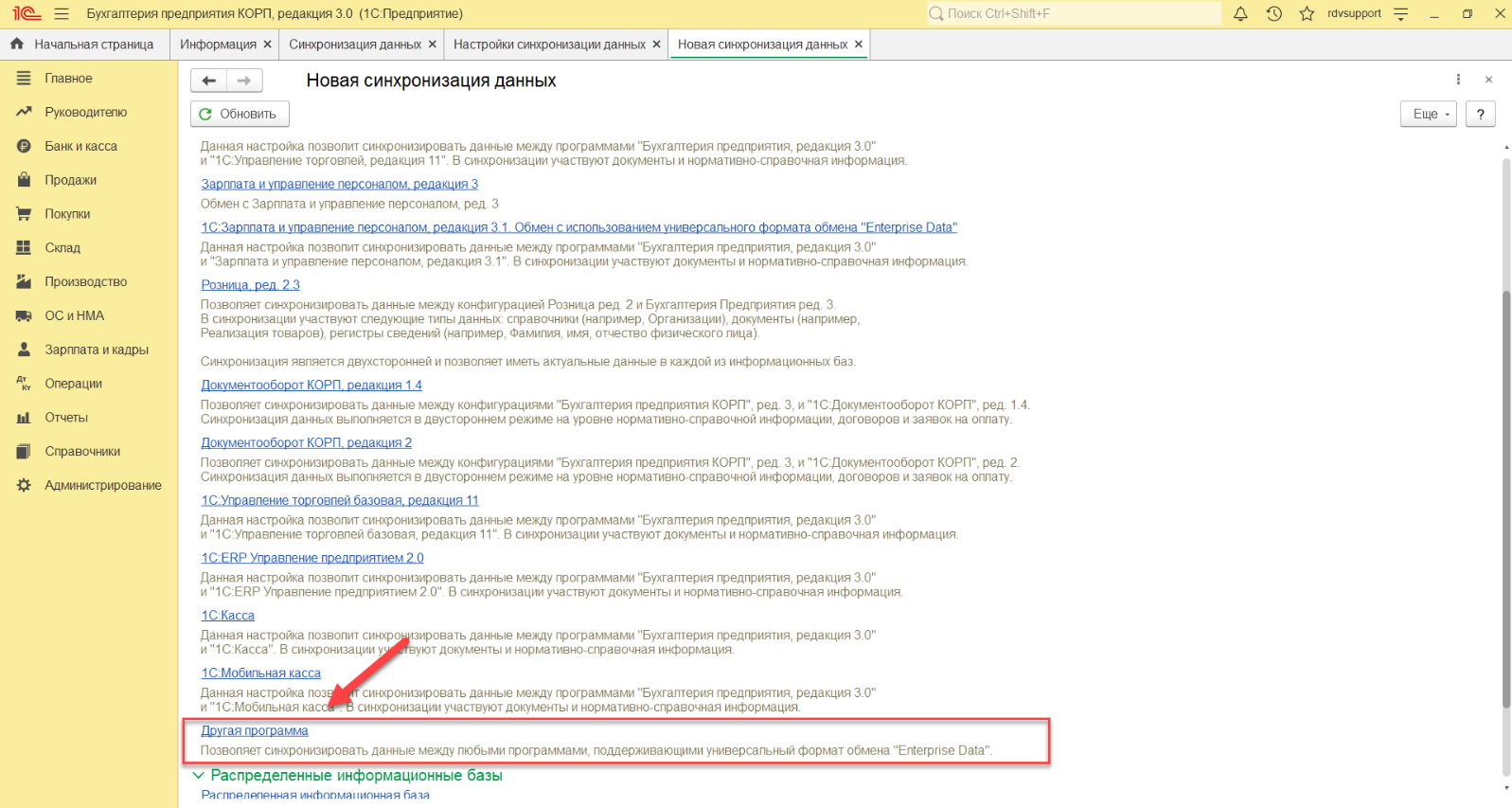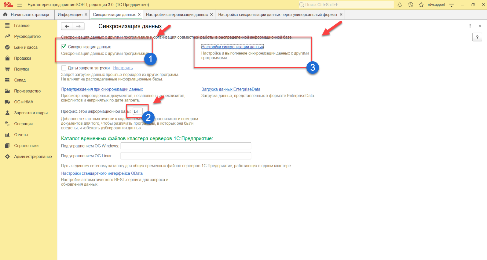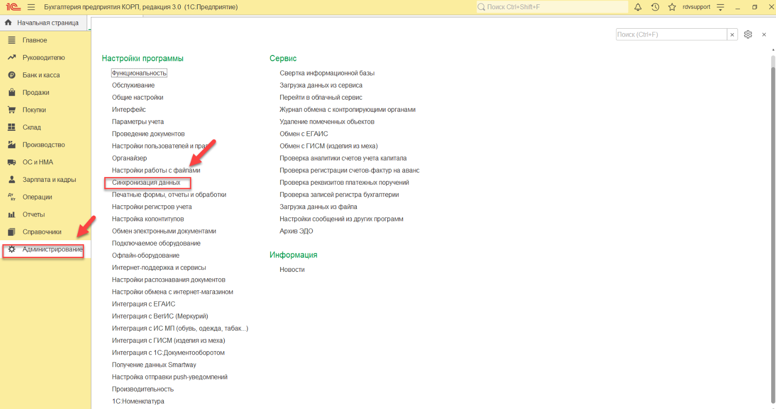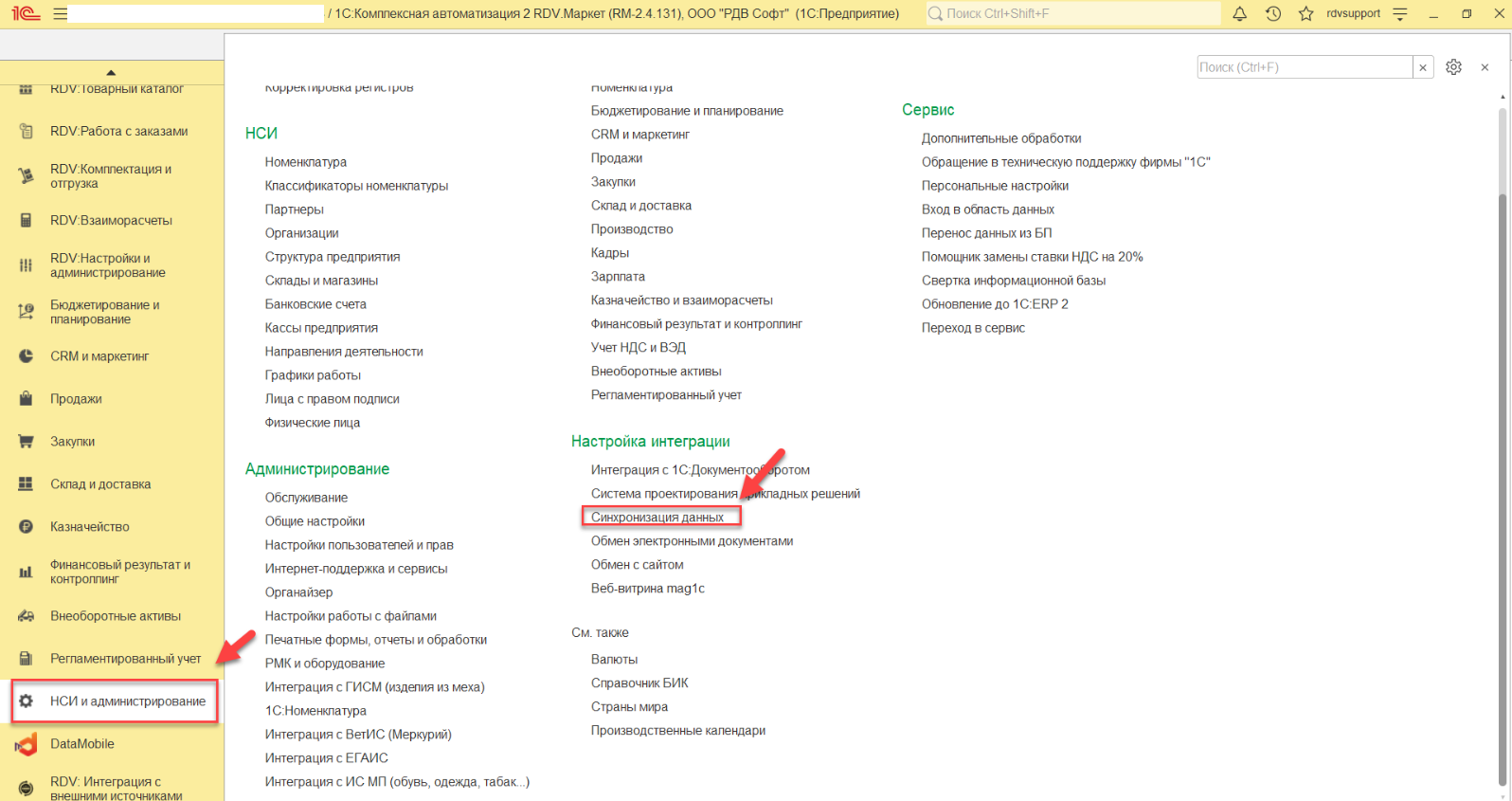 После открытия сервиса необходимо в БП перейти в раздел: "Администрирование" - "Синхронизация данных":