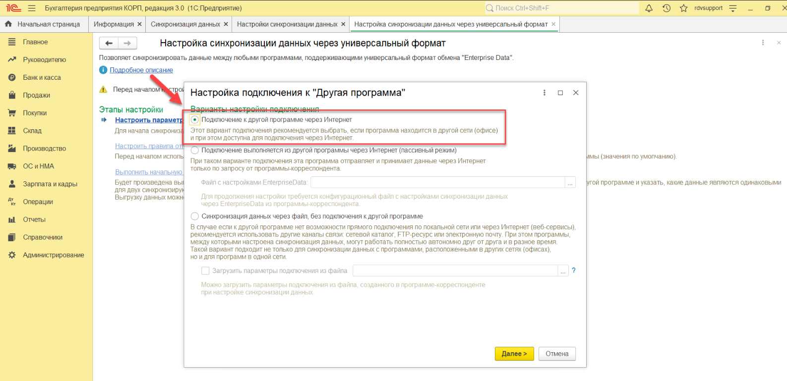 После успешного подключения к базе КА, следуя подсказкам помощника, необходимо выполнить настройки обмена данными НСИ и документами: