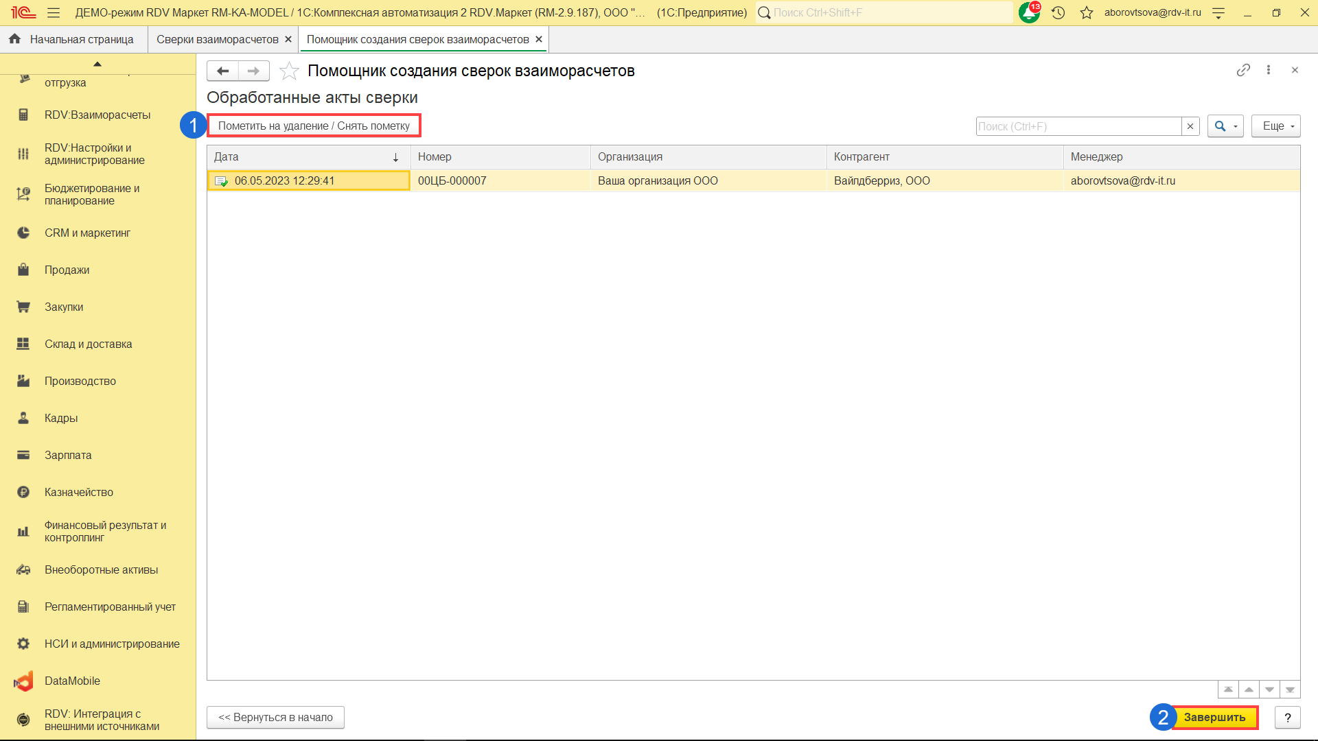 Откроется список созданных актов. Вы можете пометить на удаление лишние акты по кнопке "Пометить на удаление/ Снять пометку" (1). Чтобы выйти из окна помощника создания, нажмите на кнопку "Завершить" (2).