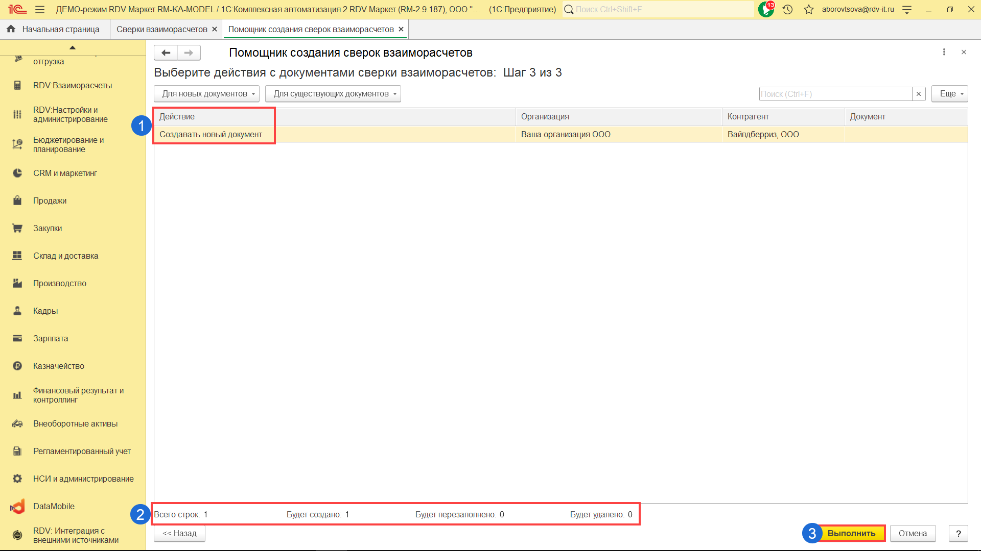 В колонке "Действие" (1) указано действие, которое будет проводиться с документом, а в нижней части страницы будет указано общее количество документов и планируемые действия с ними (2). Чтобы продолжить, нажмите на кнопку "Выполнить" (3).