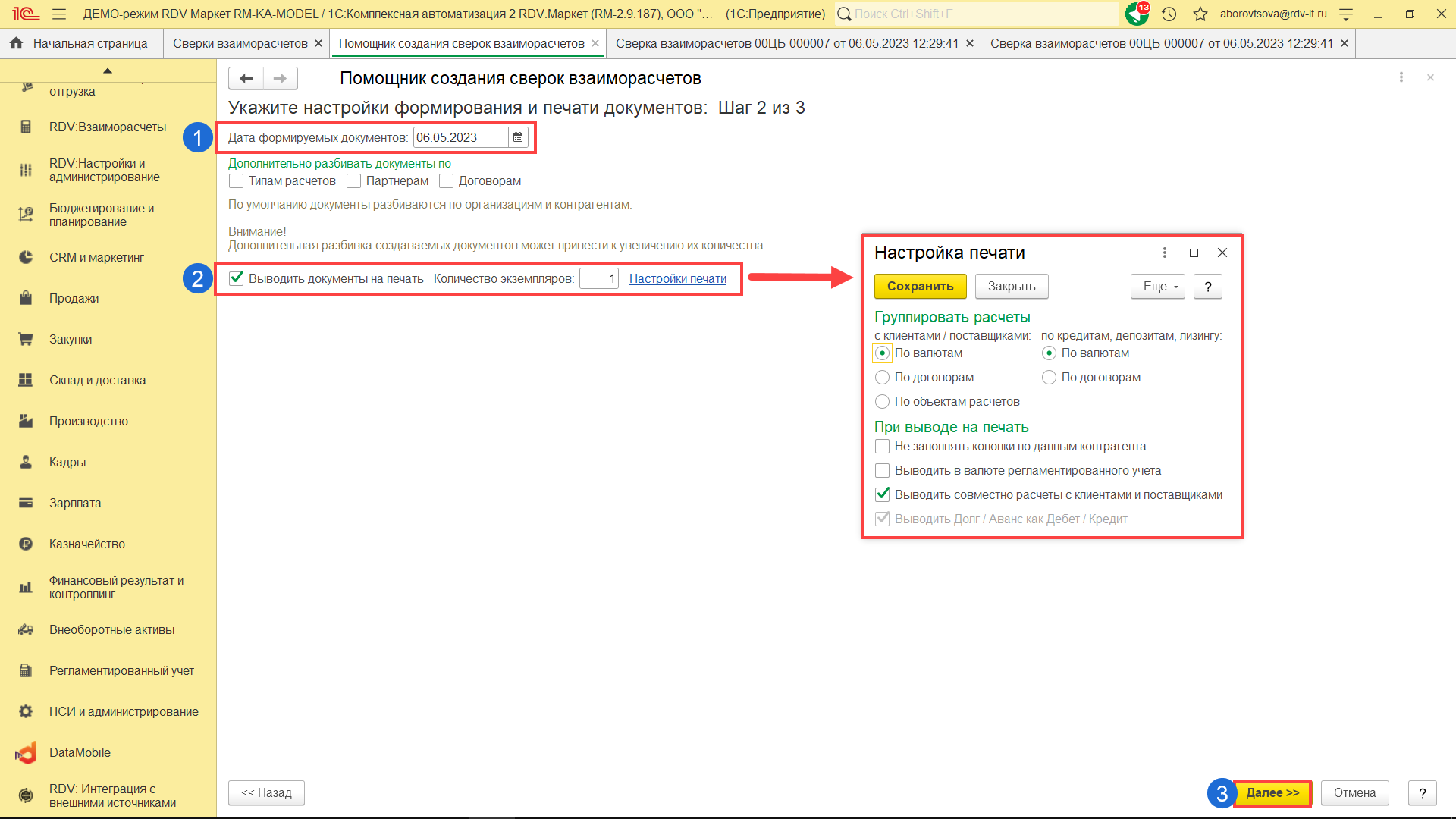 Укажите дату, на которую будут сформированы документы, (1) и, при необходимости, включите автоматический вывод акта сверки взаиморасчётов на печать (2). Чтобы продолжить, нажмите на кнопку "Далее".