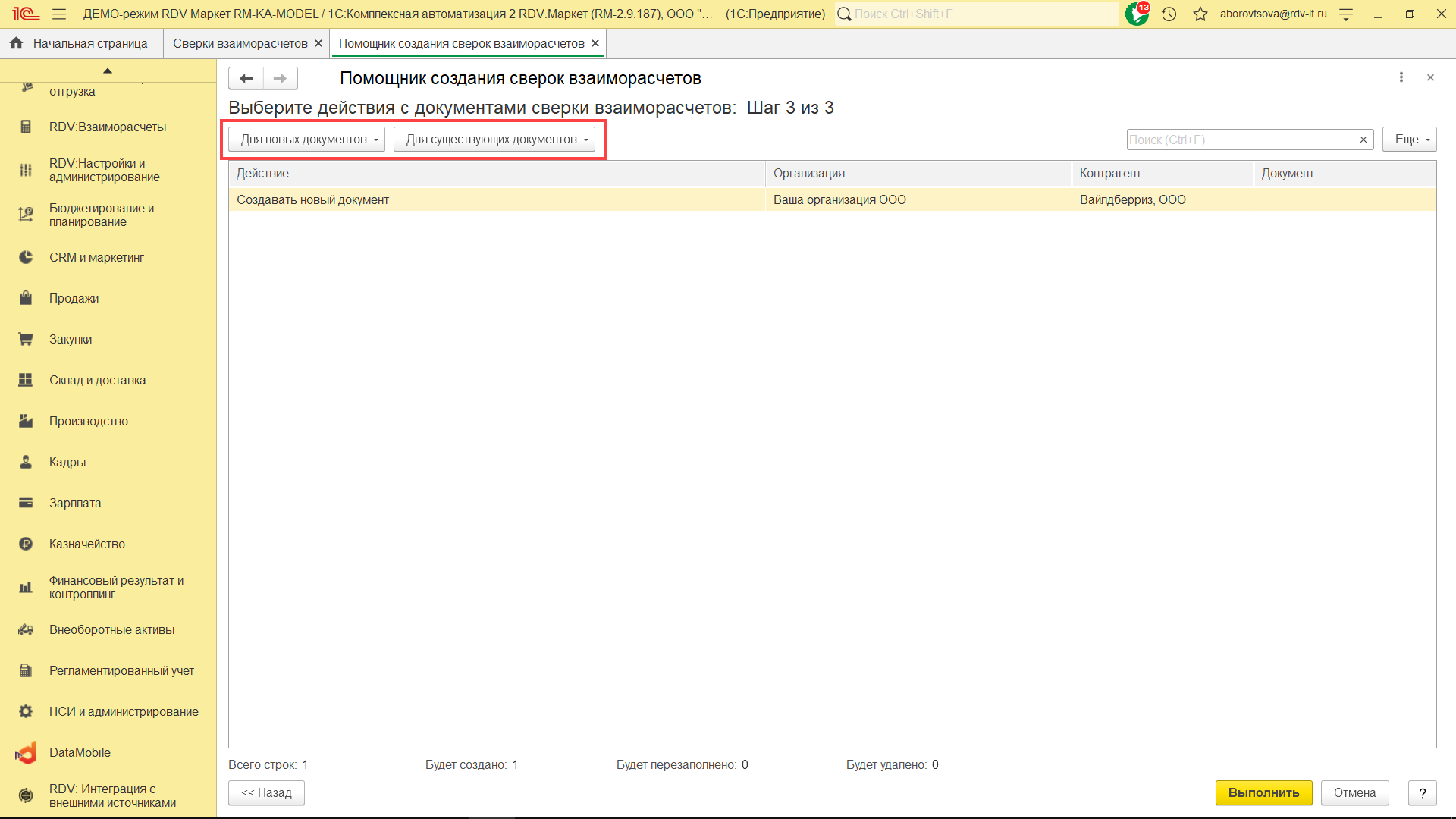 Если документов несколько, через кнопки "Для новых документов" и "Для существующих документов" Вы можете настроить порядок создания, перезаполнения и удаления документов сверки взаиморасчётов.