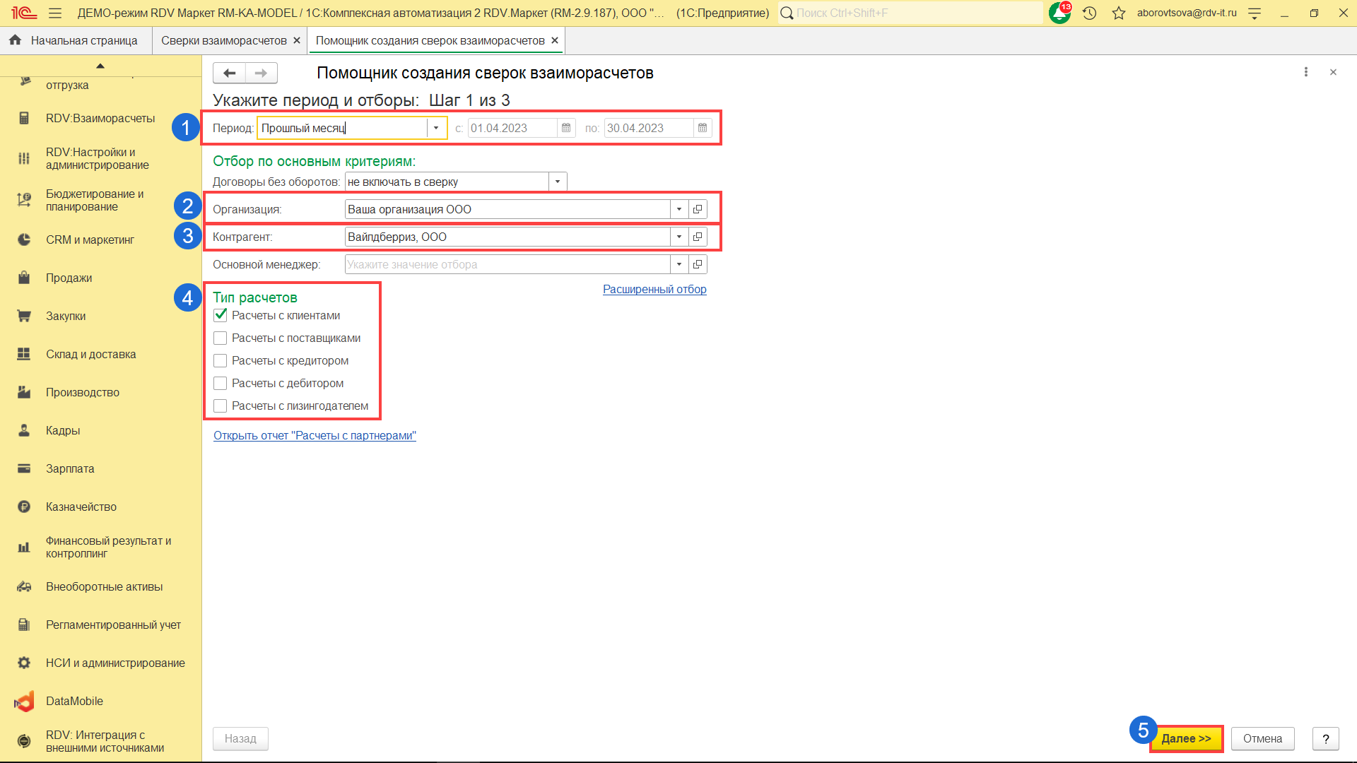 Укажите период сверки (1), организацию (2), контрагента (3), тип расчётов (4) и нажмите на кнопку "Далее".
