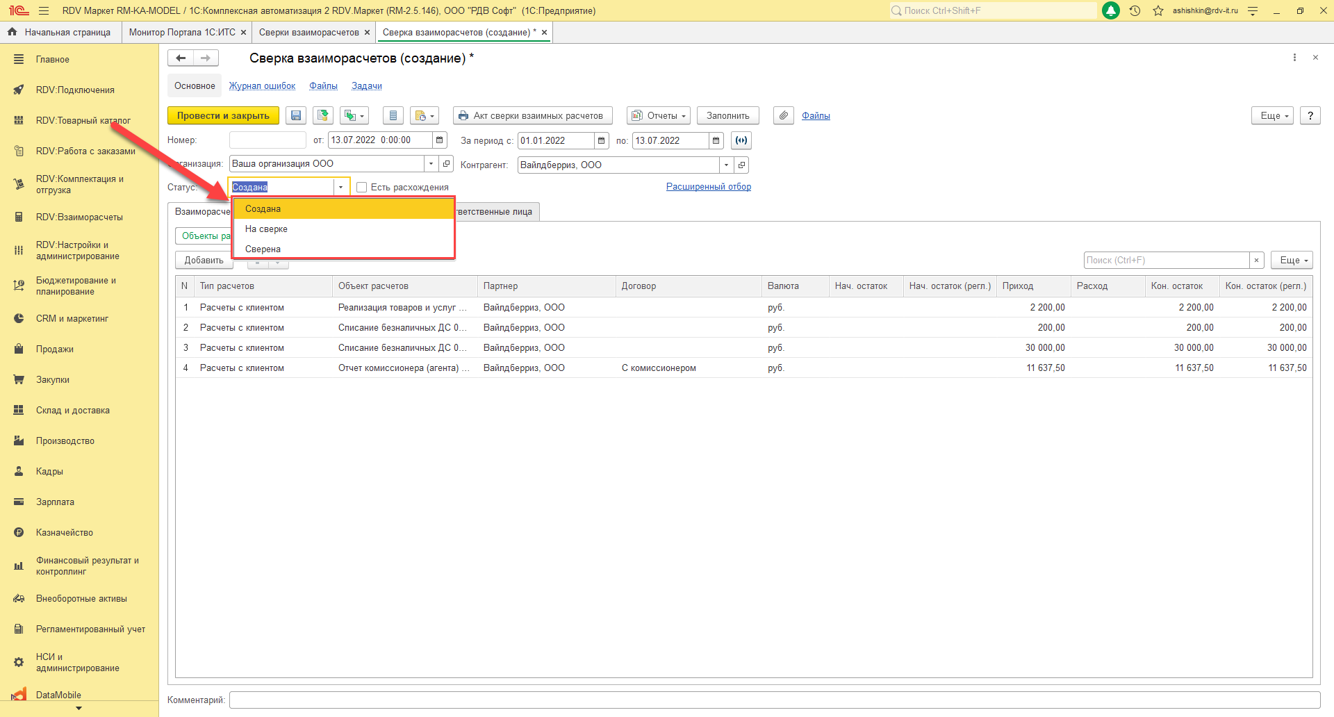 Для удобства в форме документа Вы можете выставить статус сверки: "Создана", "На сверке", "Сверена".