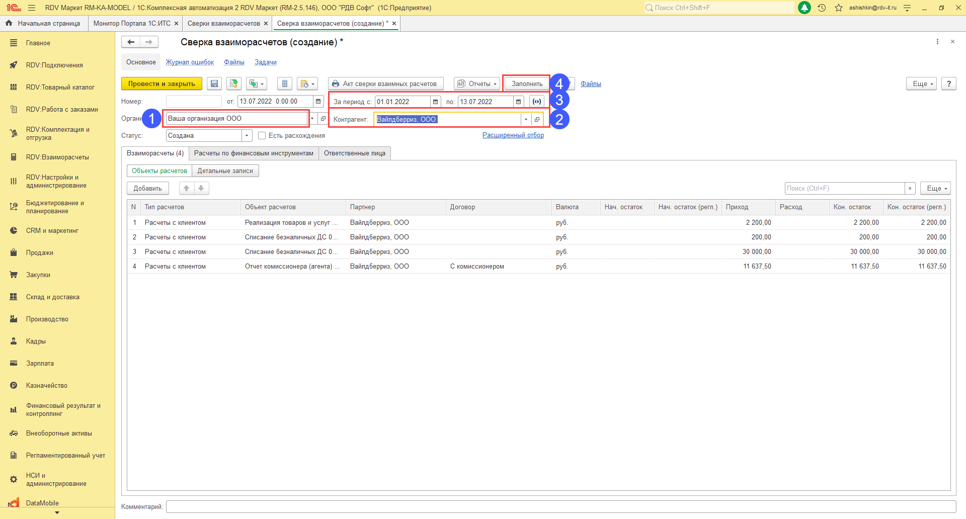 Далее необходимо заполнить организацию (1), контрагента (2), период сверки (3) и нажать кнопку "Заполнить" (4).