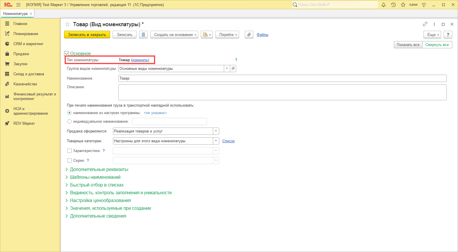 Для создания комплекта необходимо выбрать или создать вид номенклатуры в котором буде указан тип номенклатуры "Товар":