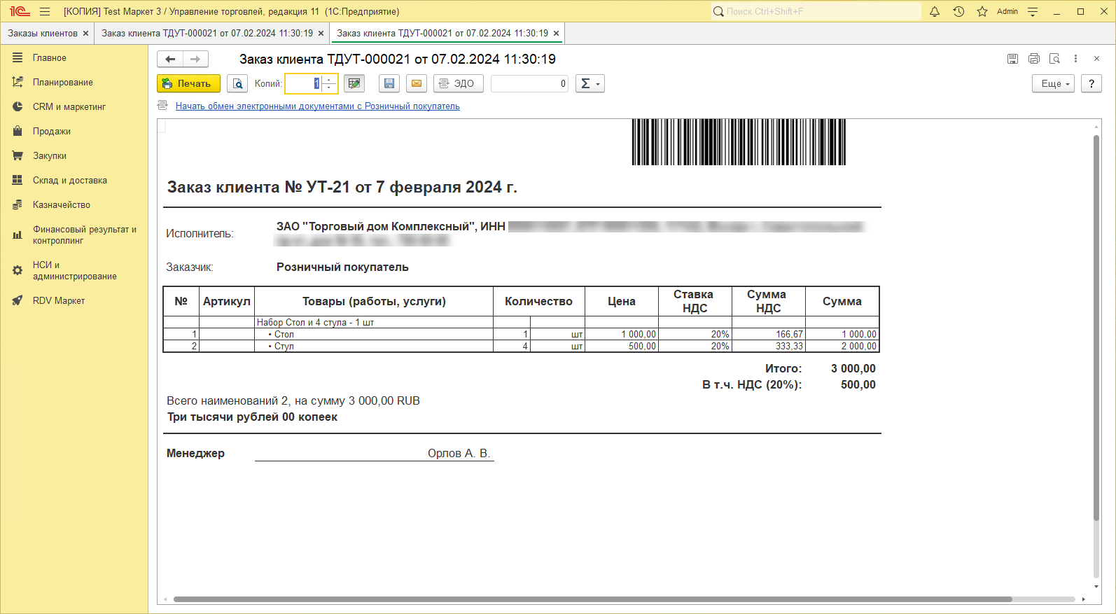 В зависимости от настроек указанных для набора будут выводится данные в печатные формы. Для нашего примера включена настройка "В печатных формах выводить набор и комплектующие":