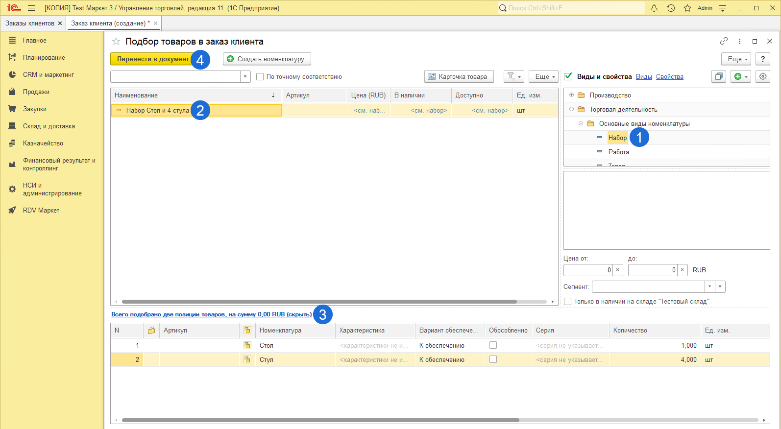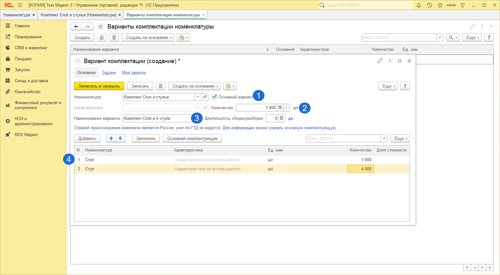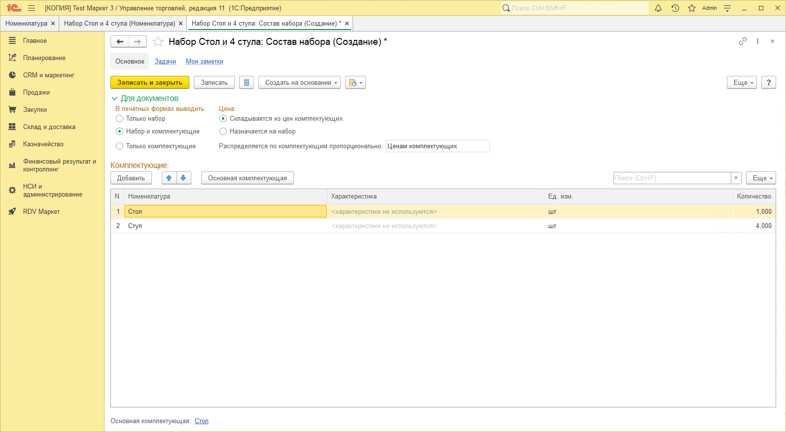 На примере состав набора "Стол и 4 стула" состоит из двух номенклатур "Стол" - 1 шт. и "Стул" - 4 шт.: