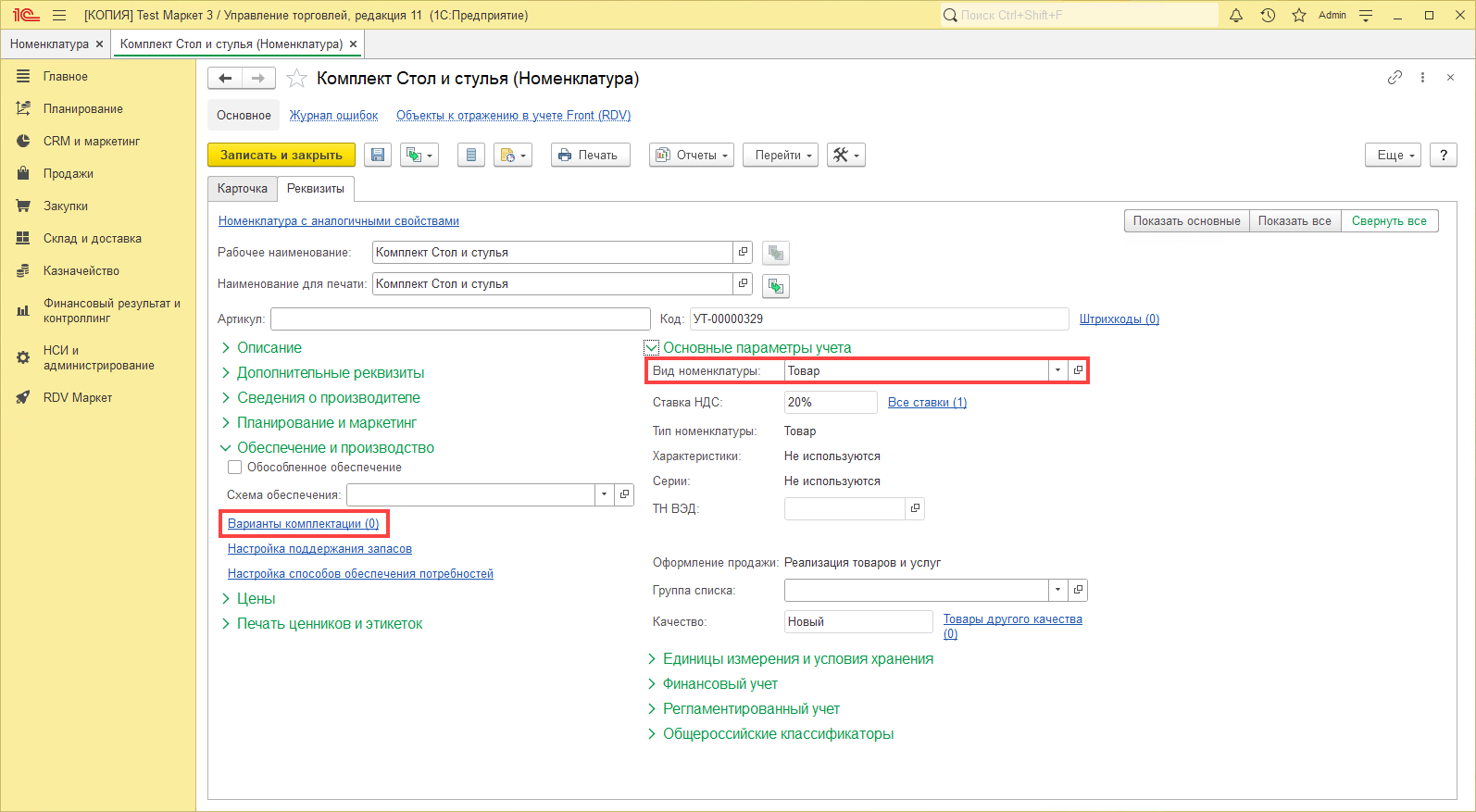 В номенклатуре необходимо выбрать вид номенклатуры с типом "Товар". В подразделе "Обеспечение и производство" по ссылке "Варианты комплектации" необходимо заполнить возможные составы комплекта: