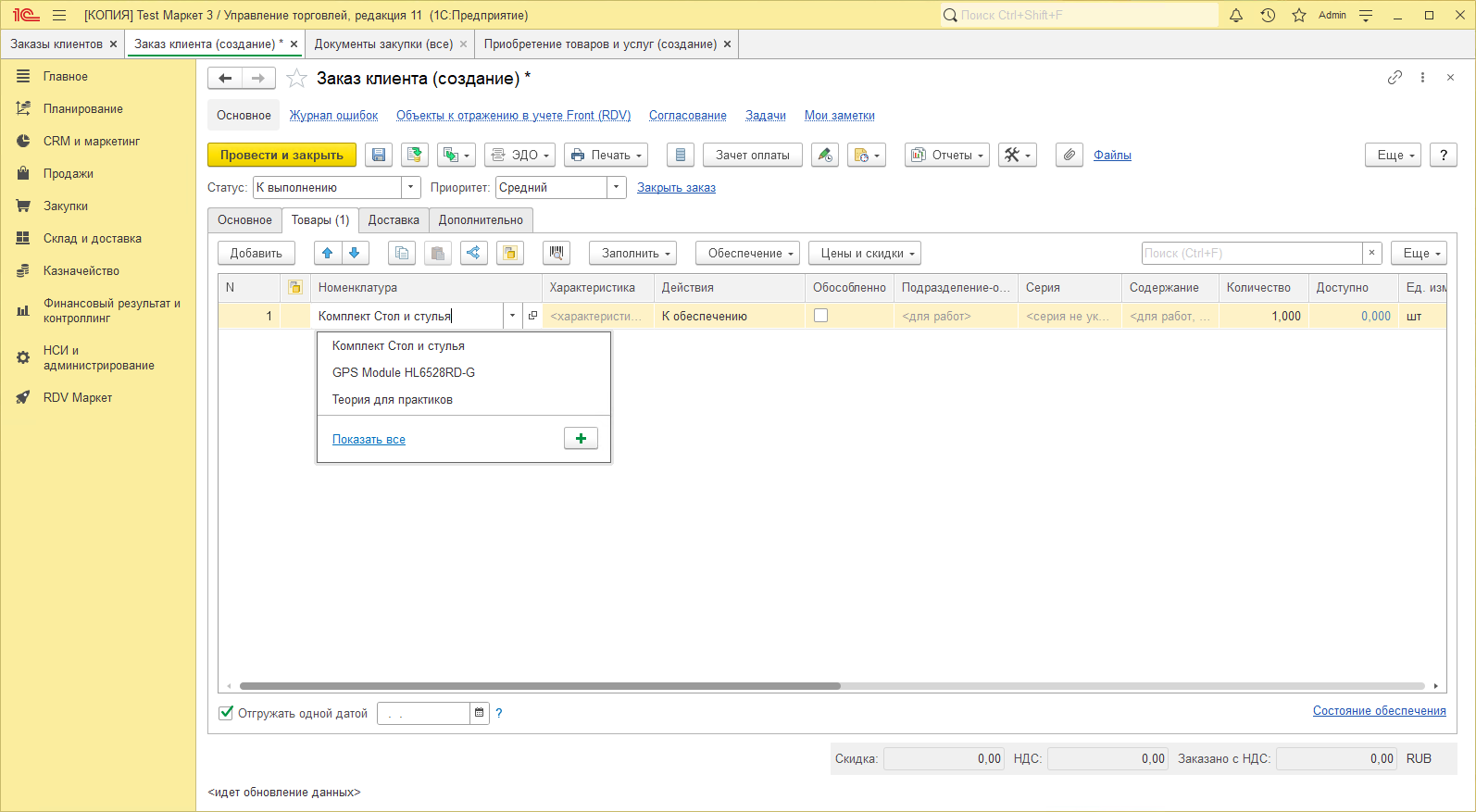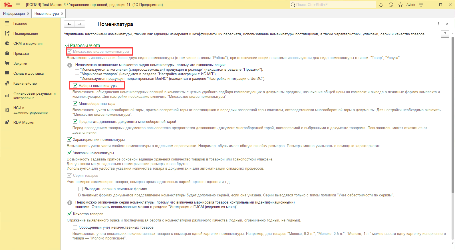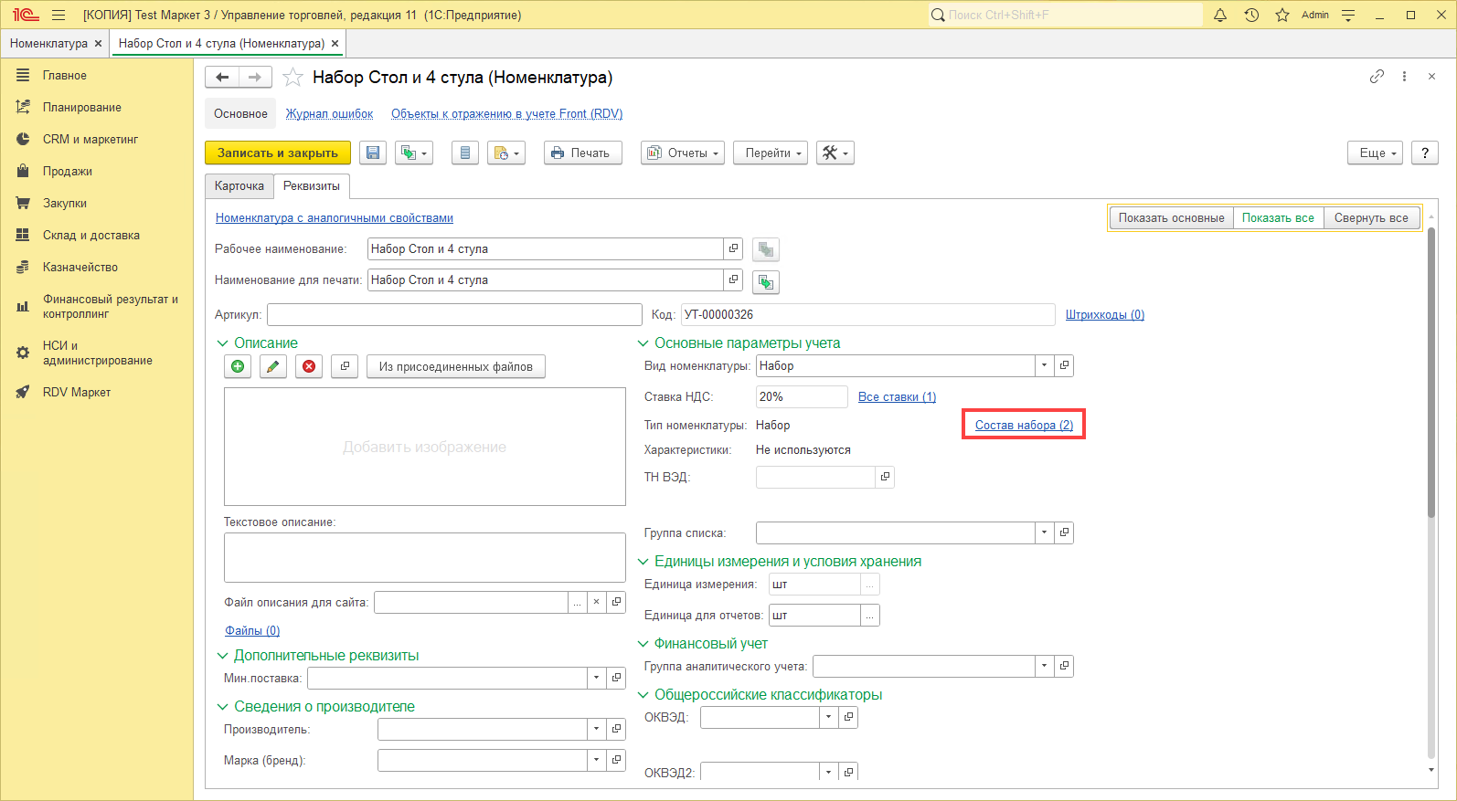 RDV Маркет 3 на текущий момент поддерживает работу только с упаковками. По комплектам передаются остатки только самого комплекта, без учета комплектующих, документы сборки не создаются. Не поддерживается работа с наборами. Поддержка работы с комплектами и наборами находится в разработке.
