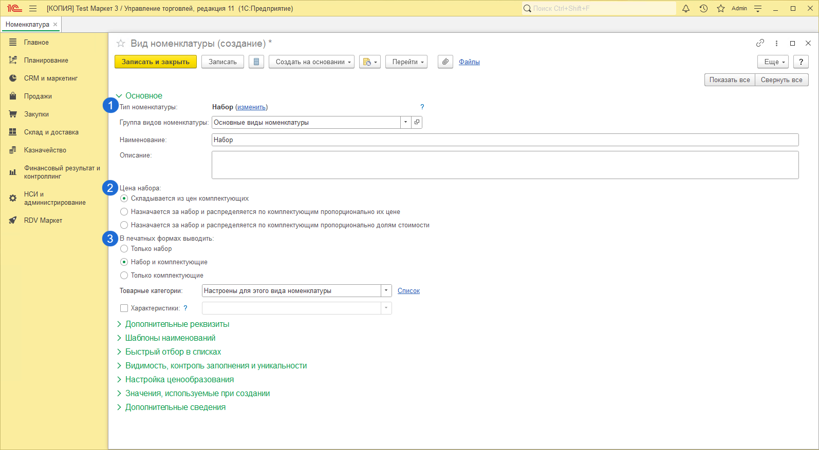Для создания набора необходимо выбрать или создать вид номенклатуры в котором буде указан тип номенклатуры "Набор"(1). Также в виде номенклатуры можно определить как рассчитывается цена набора(2) и какие данные выводить в типовых печатных формах 1С(3):