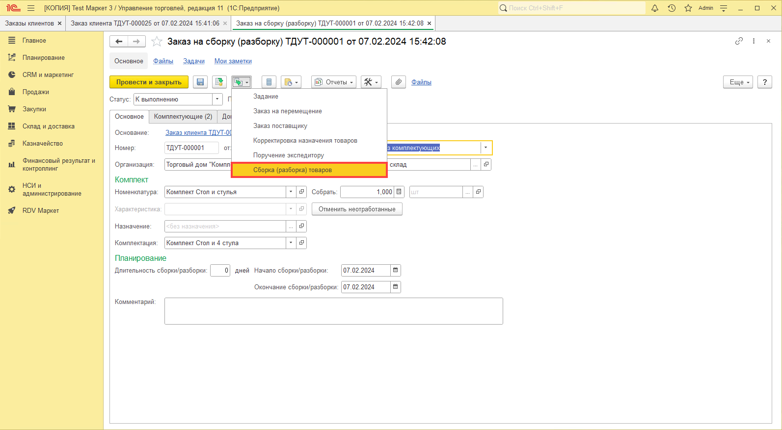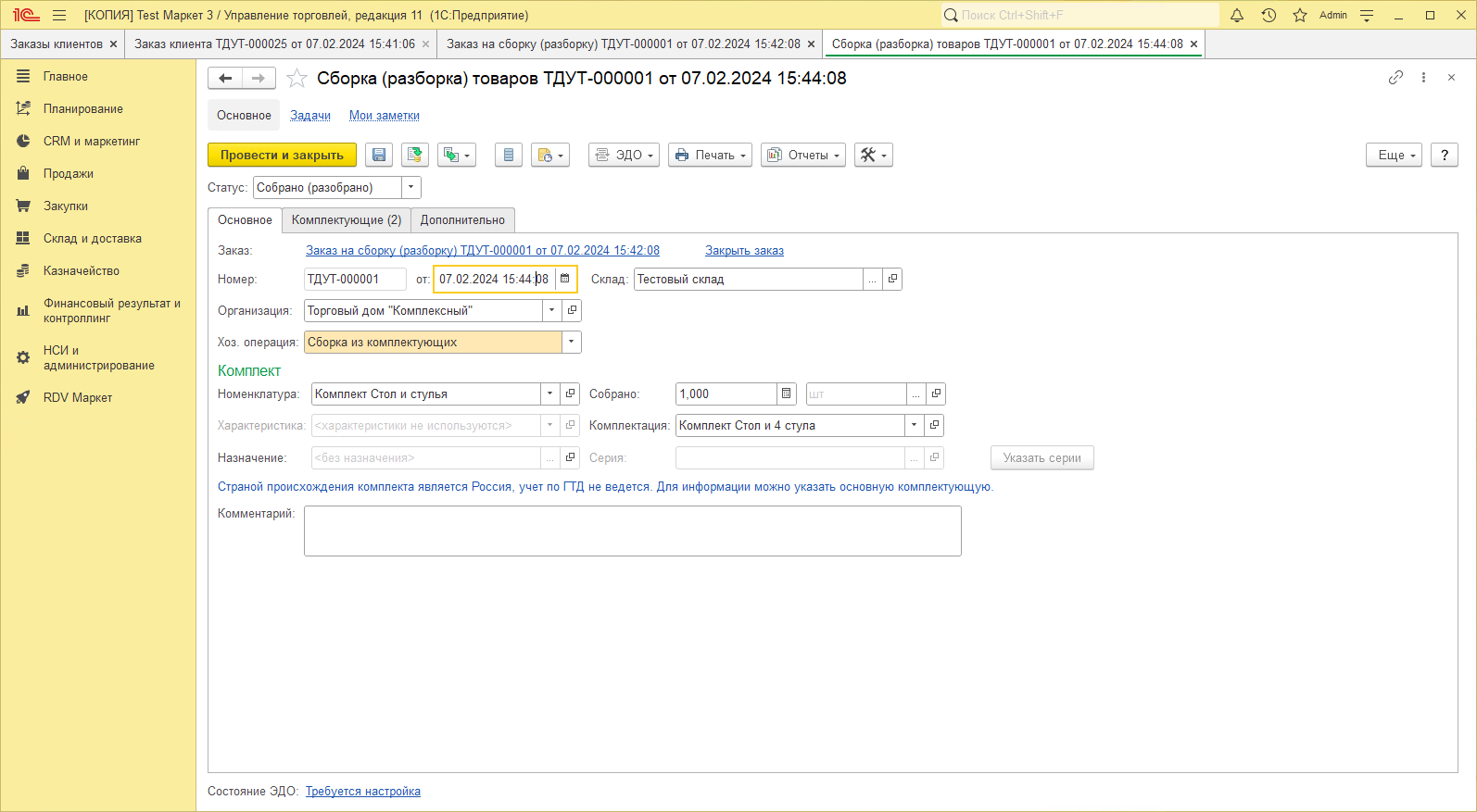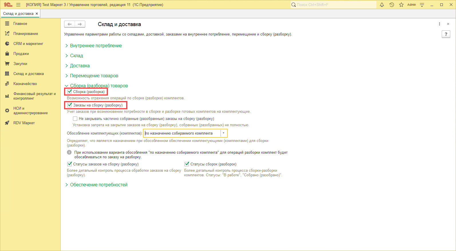 Включить настройку "Сборка (разборка)", дополнительно если для сборки необходимы документы Заказа на сборку (как в RDV Маркет 2) можно включить настройку "Заказы на сборку (разборку)":