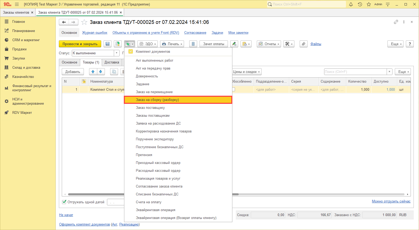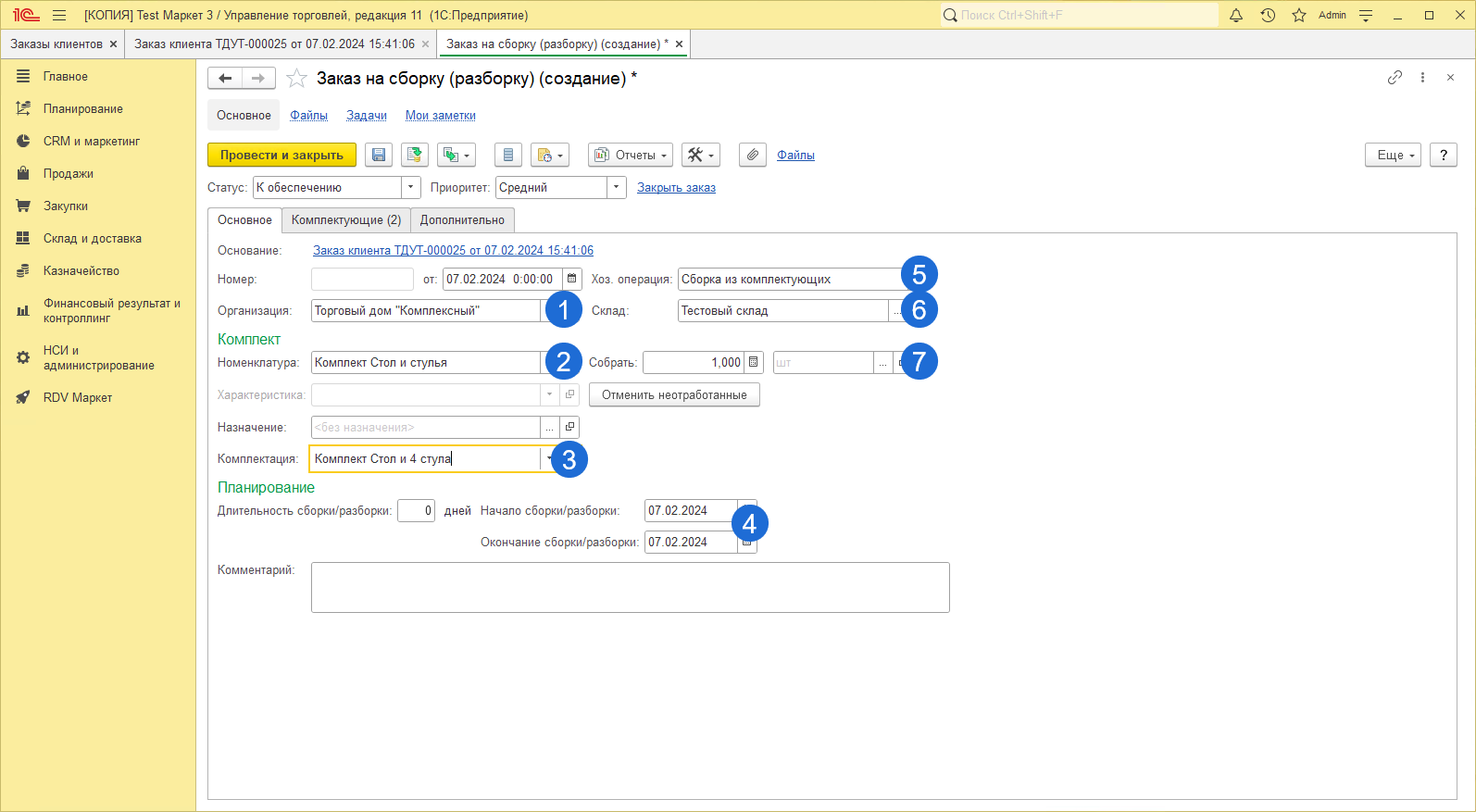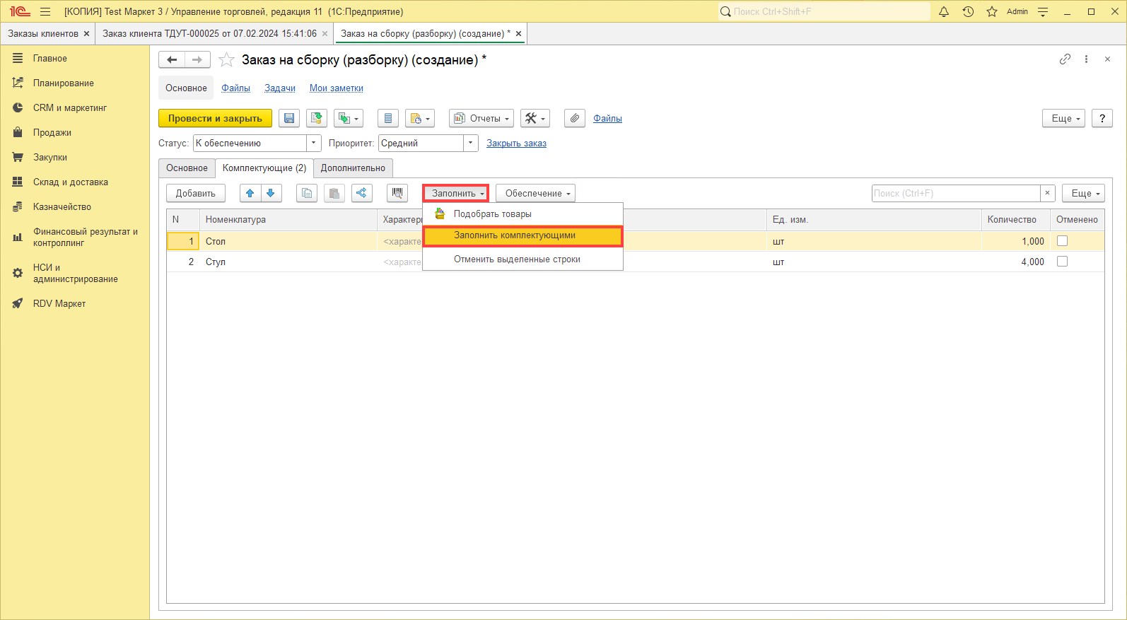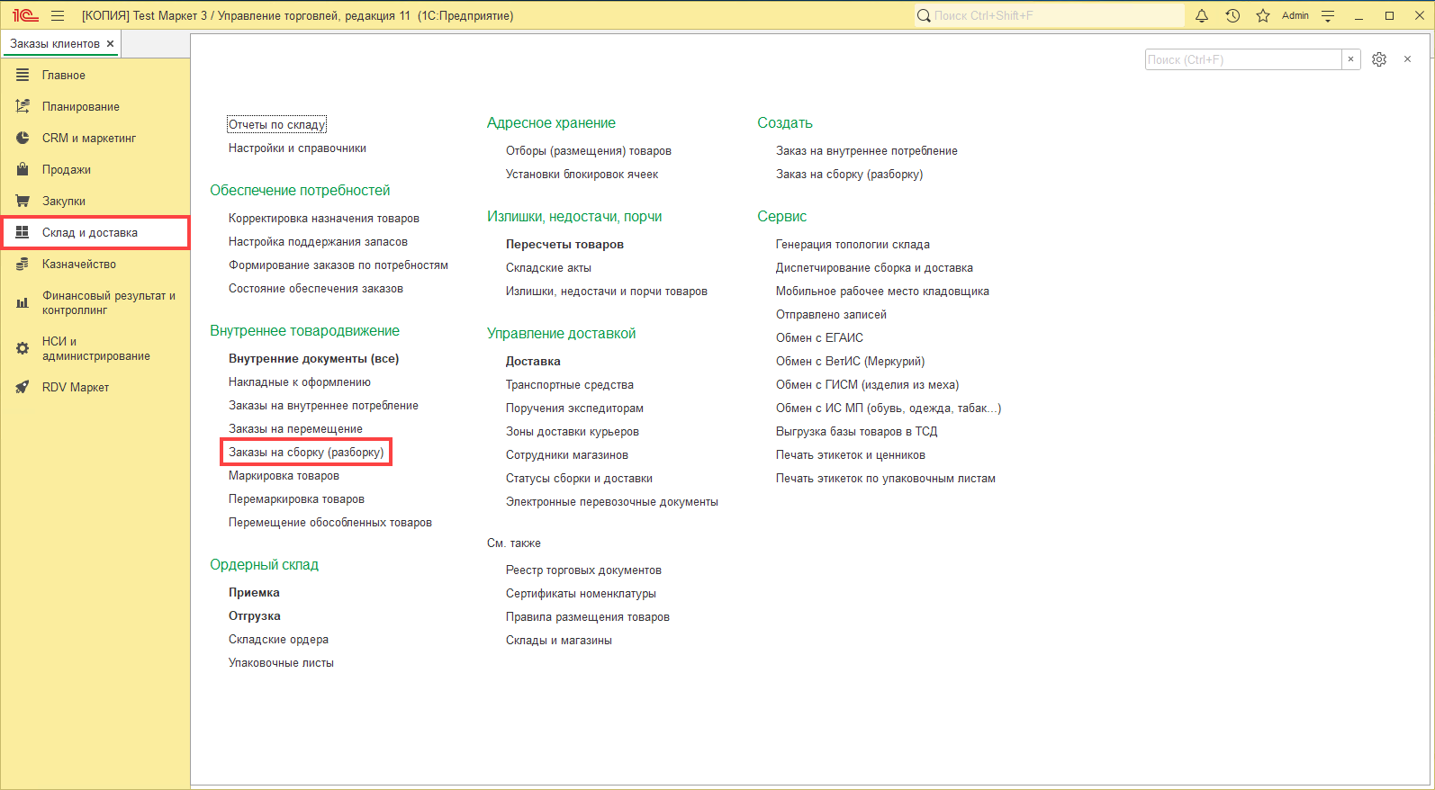 Включить настройку "Сборка (разборка)", дополнительно если для сборки необходимы документы Заказа на сборку (как в RDV Маркет 2) можно включить настройку "Заказы на сборку (разборку)":