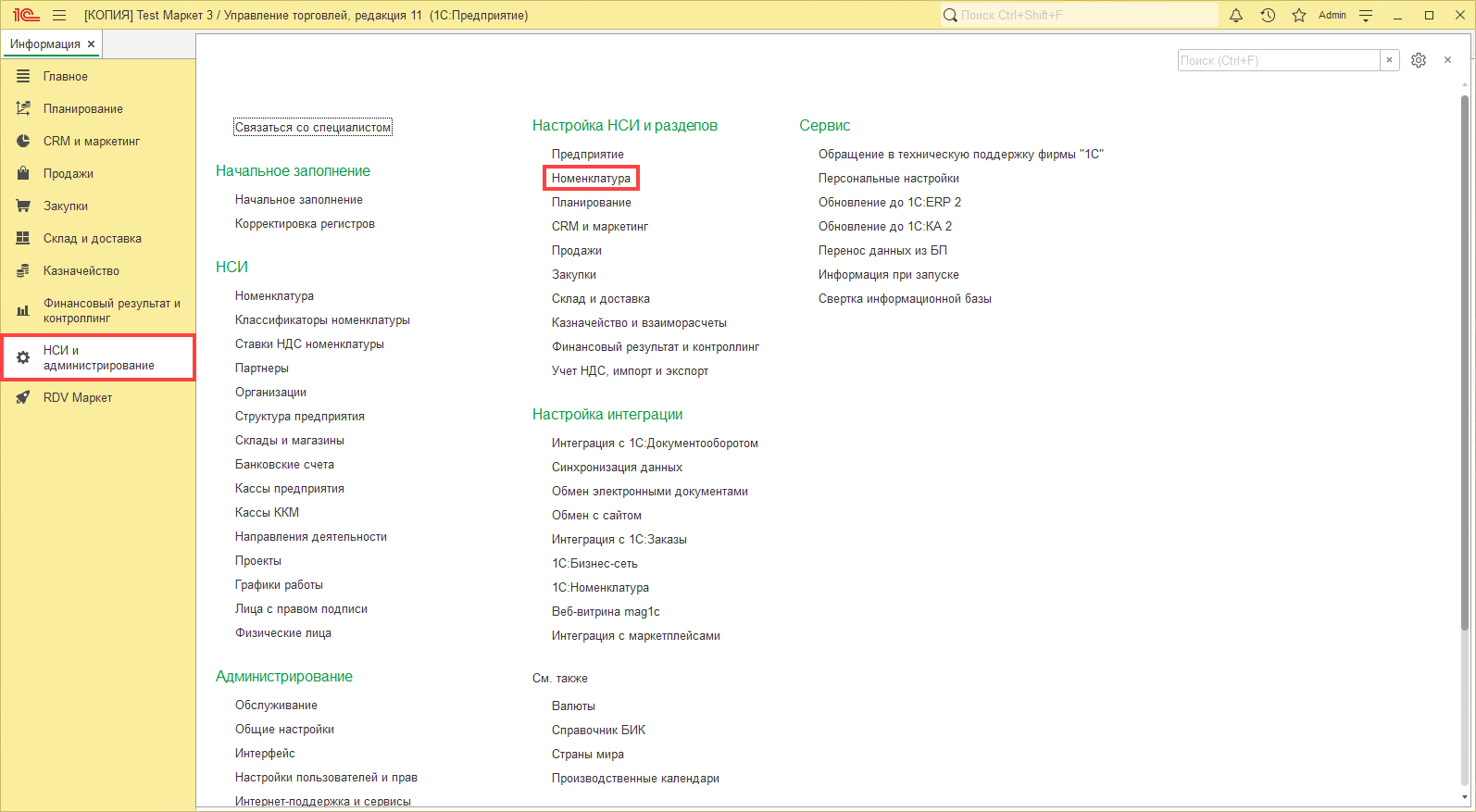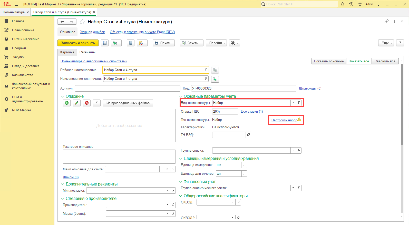 Для настройки наборов необходимо перейти в раздел "НСИ и администрирование" - "Номенклатура":