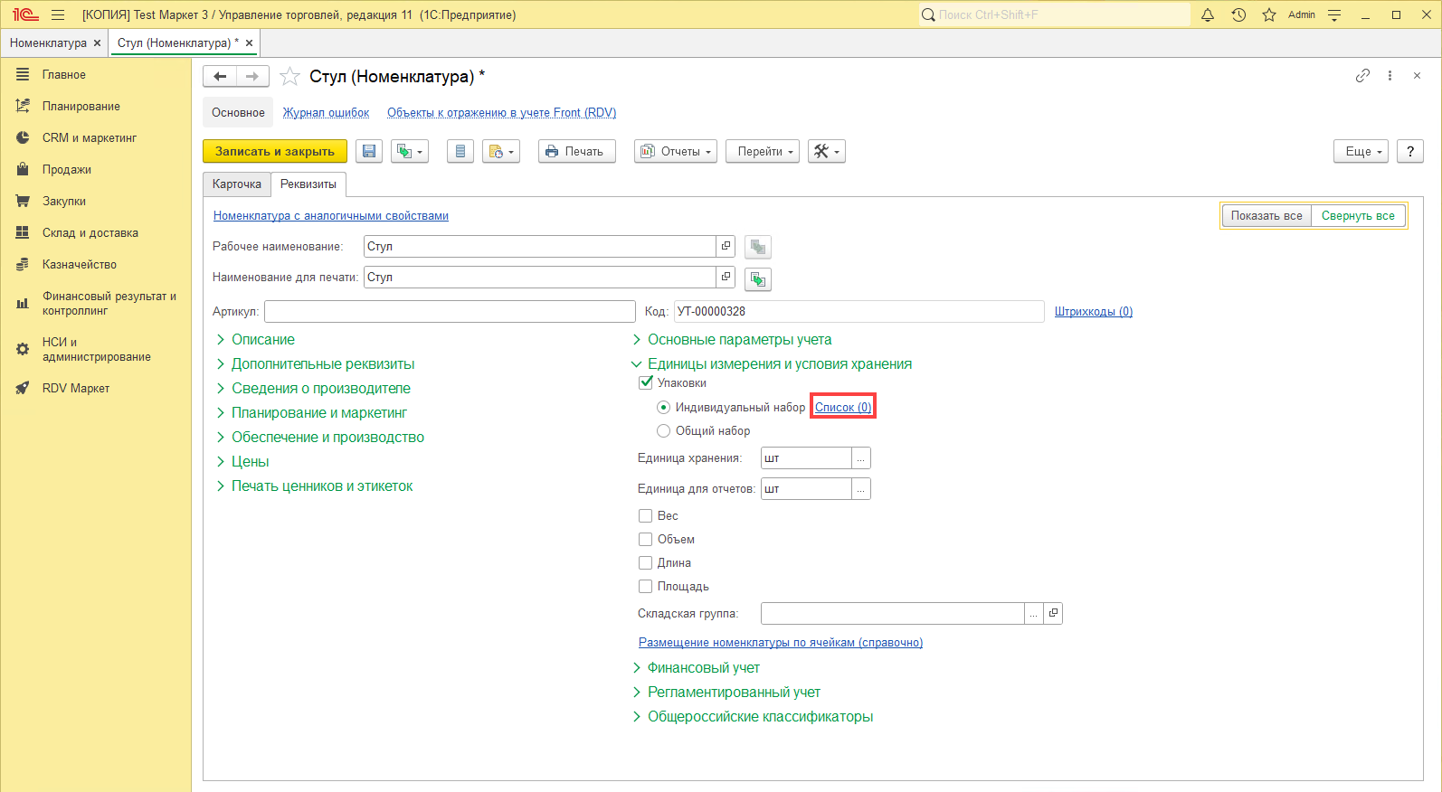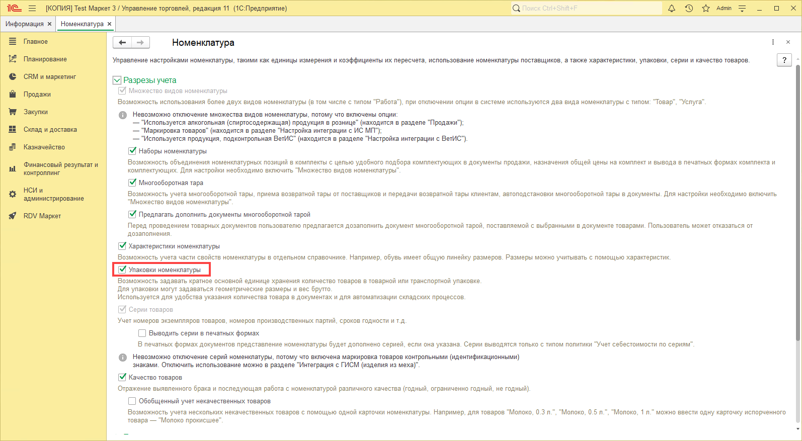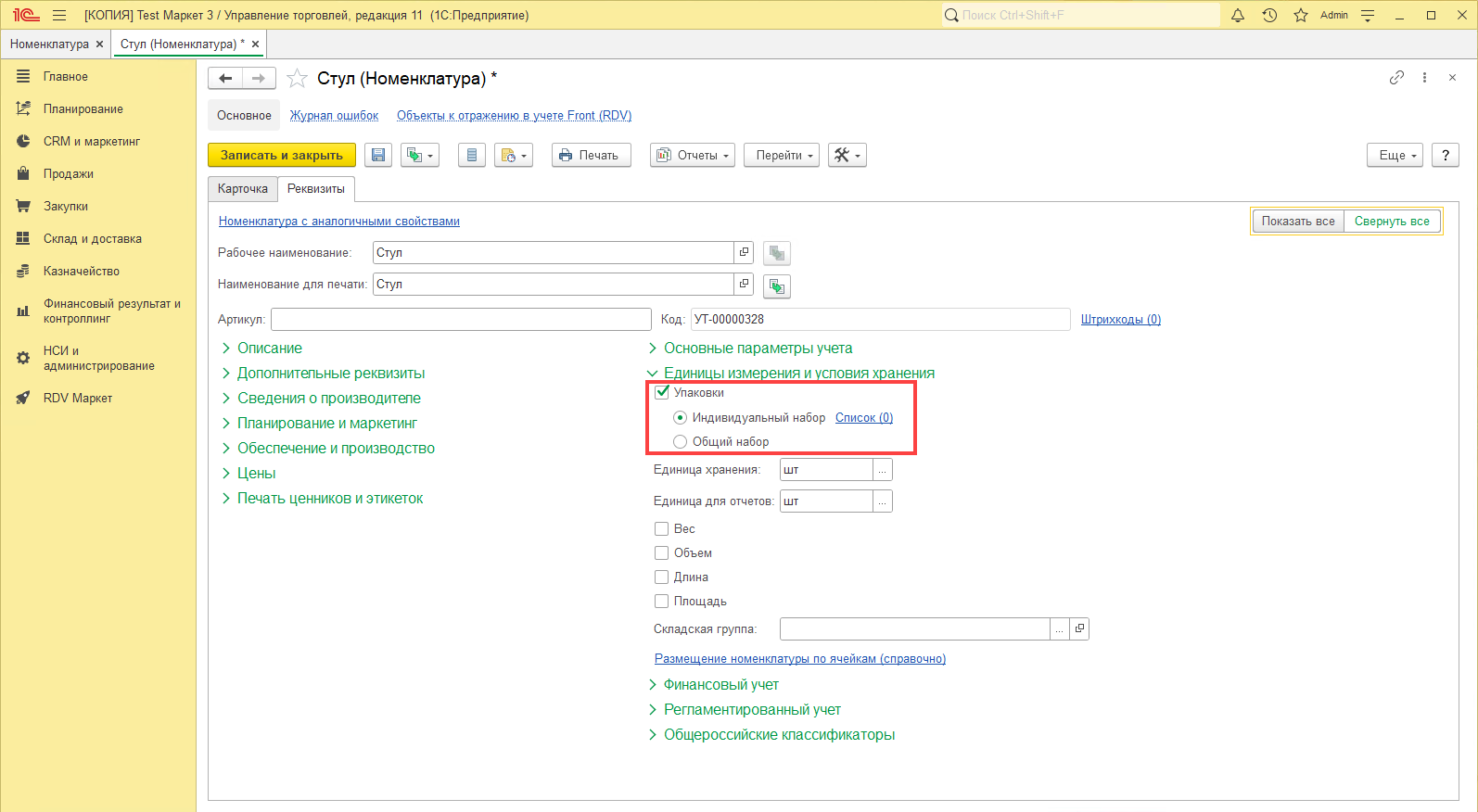 Для настройки упаковки у номенклатуры необходимо перейти в подраздел "Единицы измерения и условия хранения", включить "Упаковки" и выбрать какой набор упаковок будет использоваться для номенклатуры: