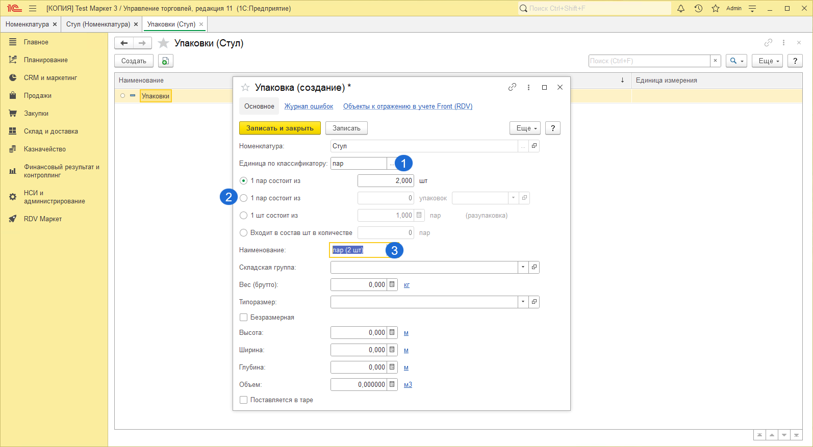 - Упаковка - создается отдельная единица измерения для элемента номенклатуры с указанием, сколько штучного товара в упаковке для которого заводится упаковка. (Пример: корм может продаваться поштучно - 1 шт. или может быть заведена упаковка и продавать/хранить на складе в упаковках - 12 шт.)