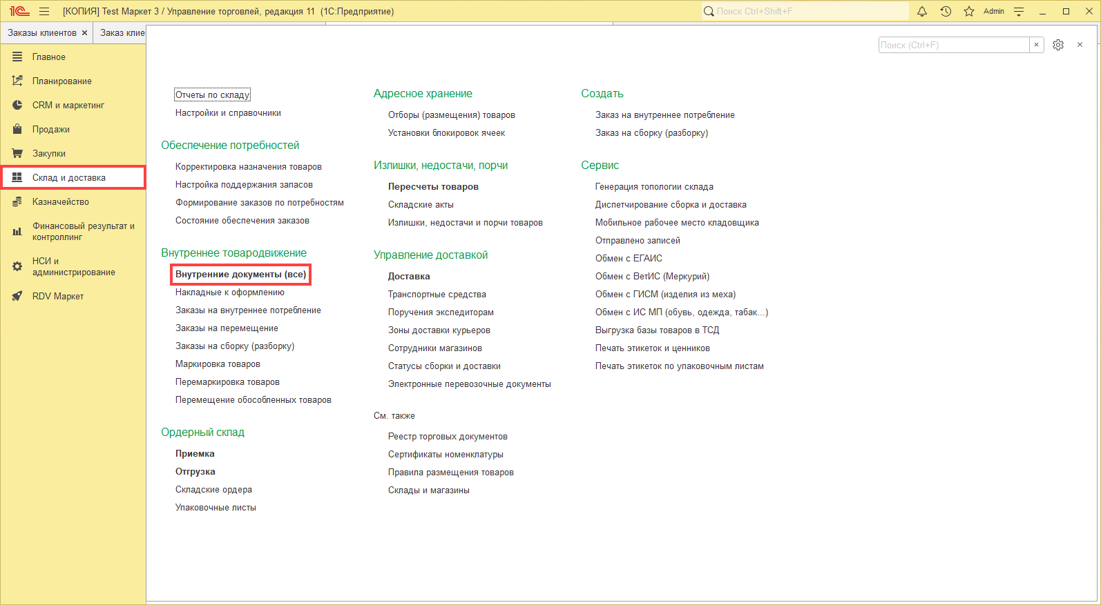 Документы можно создать на основании или в разделе "Склад и доставка":