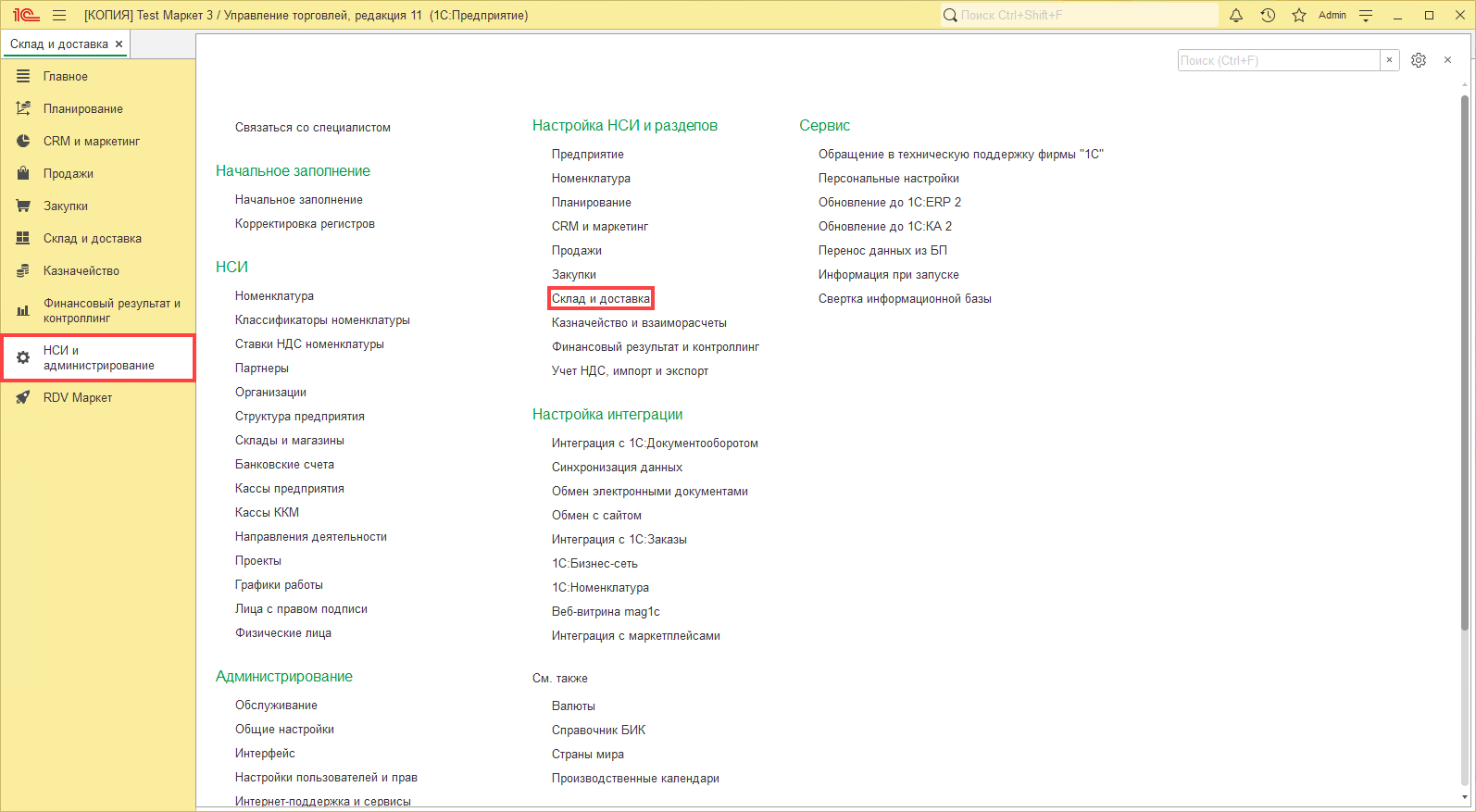 Для работы с комплектами необходимо перейти в раздел "НСИ и администрирование" - "Склад и доставка":