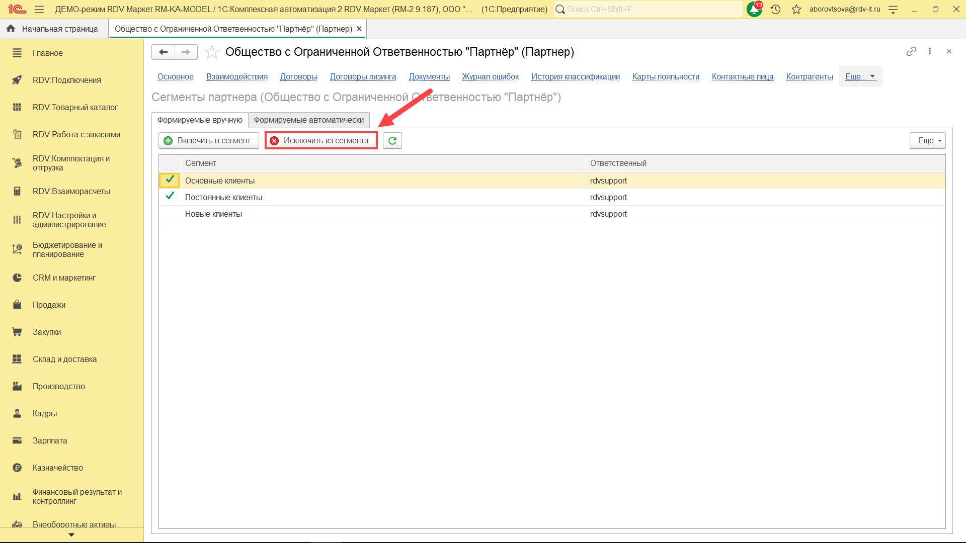Исключить клиента из сегмента можно, если выделить сегмент и нажать на кнопку "Исключить из сегмента".