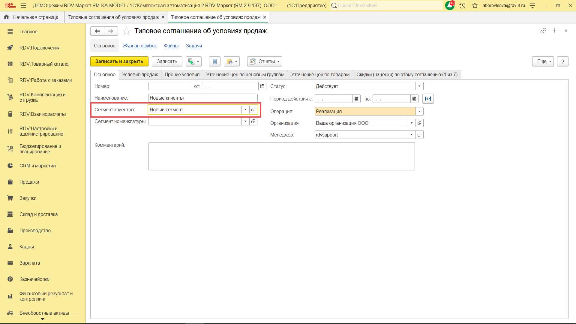 Созданный сегмент клиентов возможно добавить в типовое соглашение с клиентами на закладке "Основное".