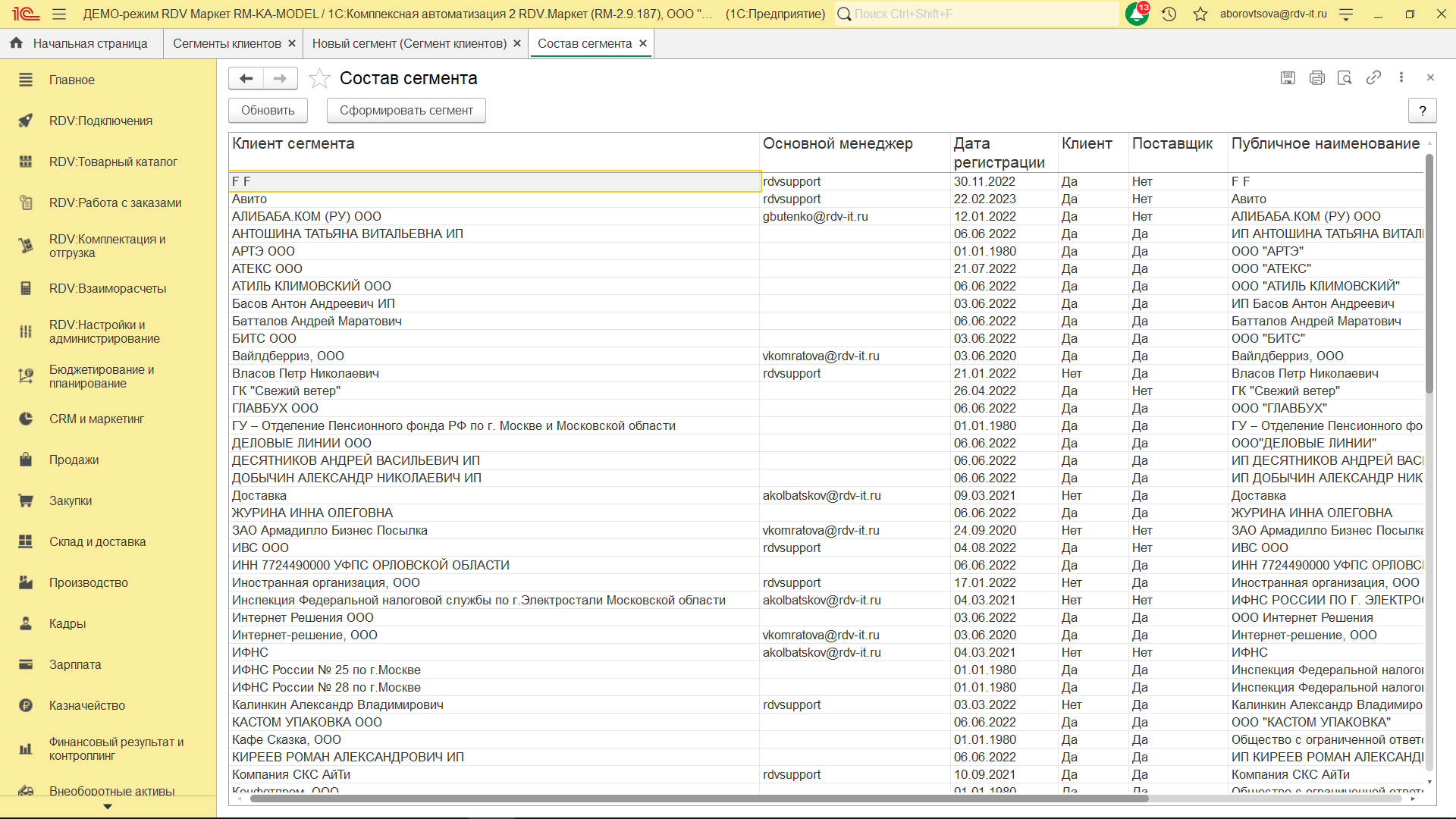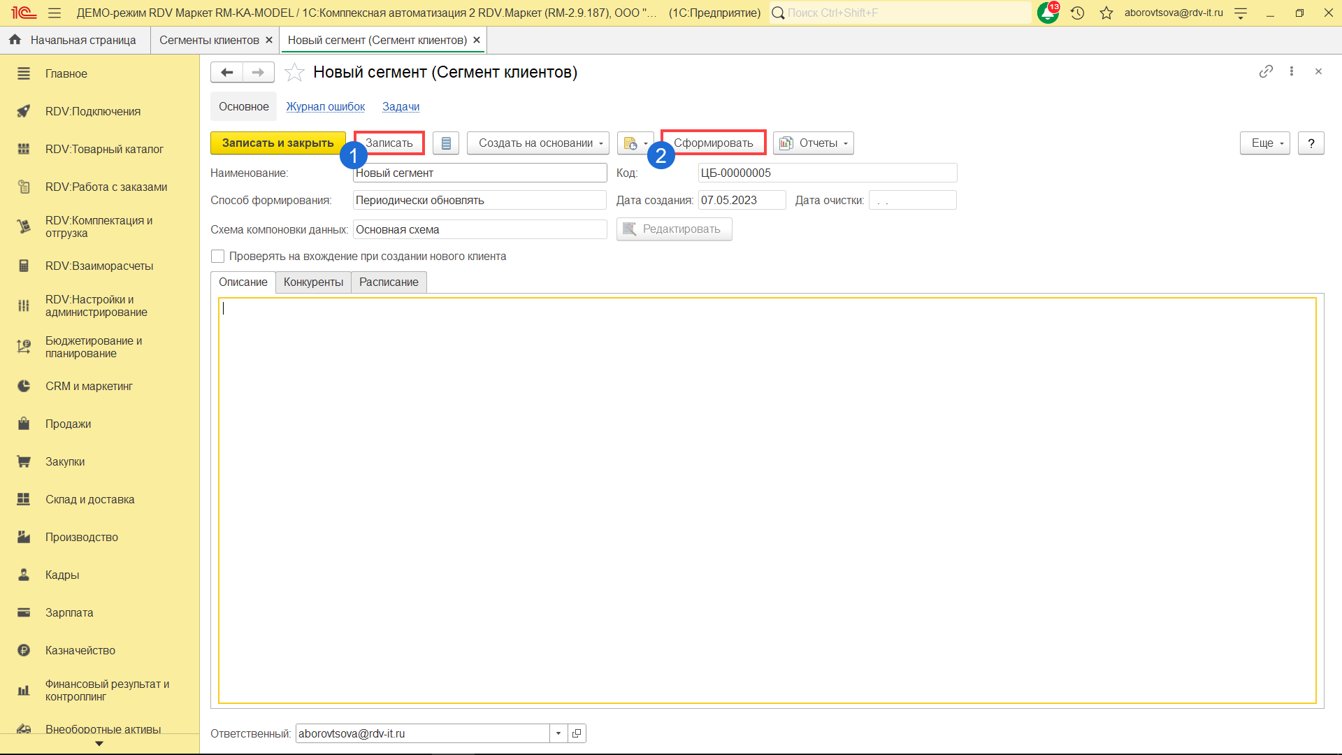 Сохраните новый сегмент по кнопке "Записать" и нажмите на кнопку "Сформировать", чтобы заполнить сегмент клиентами по отбору.