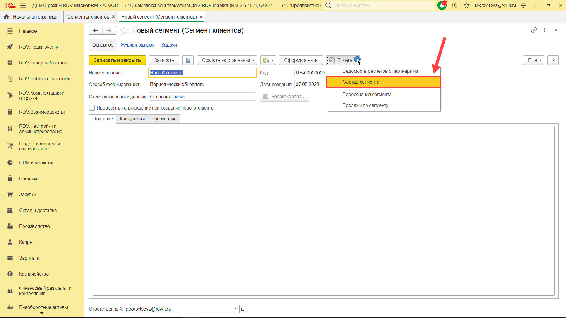 Чтобы посмотреть какие клиенты входят в сегмент по установленному отбору, нажмите на кнопку "Отчёты" - "Состав сегмента".
