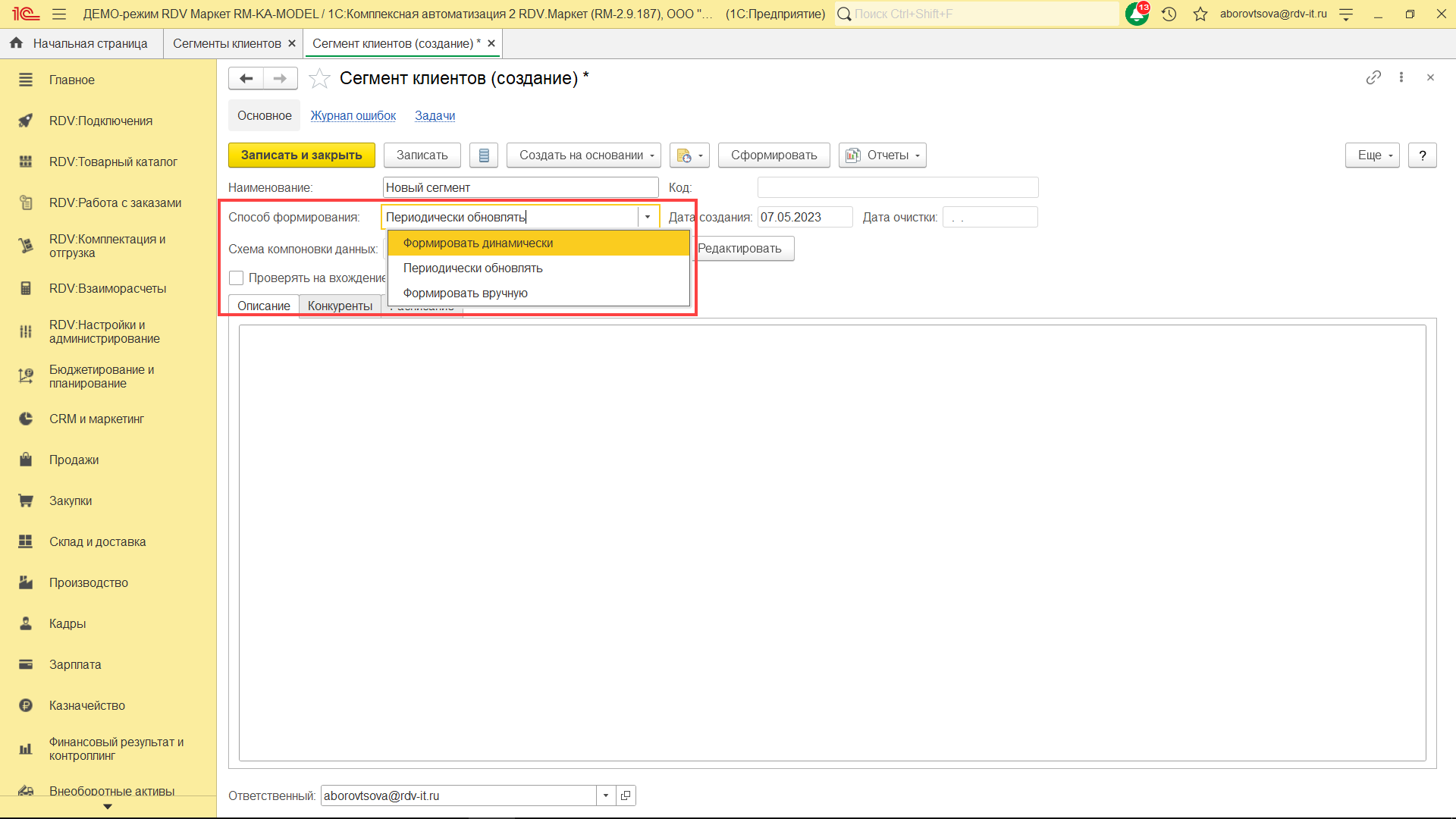 - Формировать динамически. Задаются правила, по которым происходит автоматическое формирование сегмента - при каждом запросе. Это создает дополнительную нагрузку при работе с большими справочниками. Такие сегменты нельзя использовать в соглашениях.