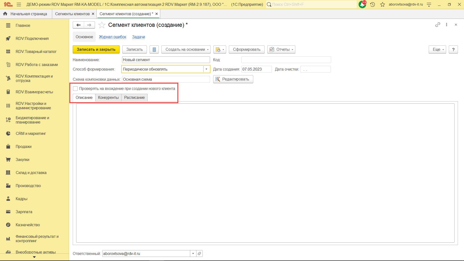 Дополнительно можно указать описание сегмента, добавить конкурентов, а также установить расписание регламентного задания для автоматического обновления сегмента и установить флаг "Проверять на вхождение при создании нового клиента", который позволит системе автоматически добавлять новосозданного клиента в сегмент, если он попадает под установленный отбор (последние две настройки доступны только для способа формирования "Периодически обновлять").