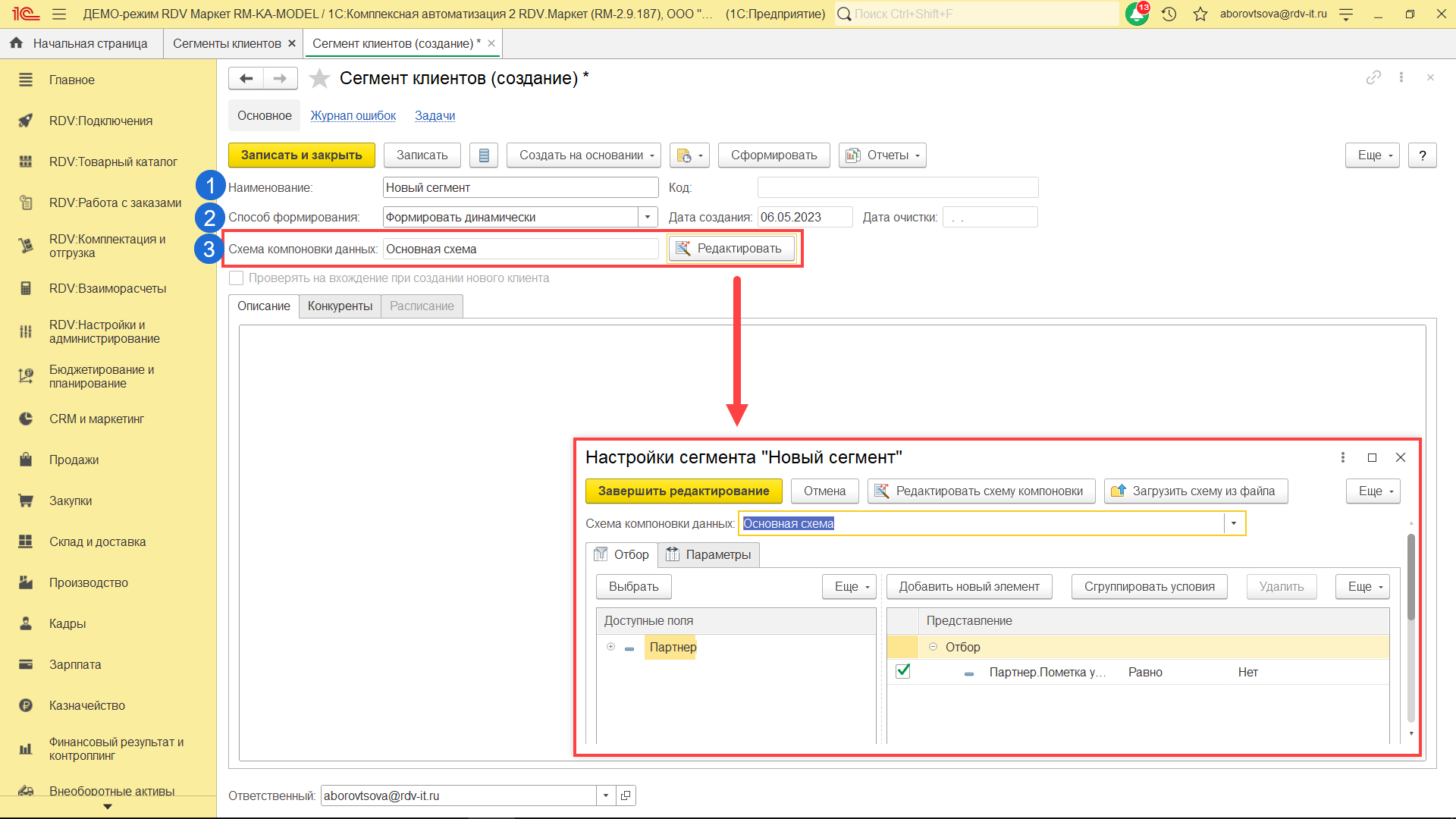 В создаваемом сегменте необходимо указать наименование (1), способ формирования (2) и схему компоновки данных (3) - отбор, по которому будут отбираться клиенты в сегмент.