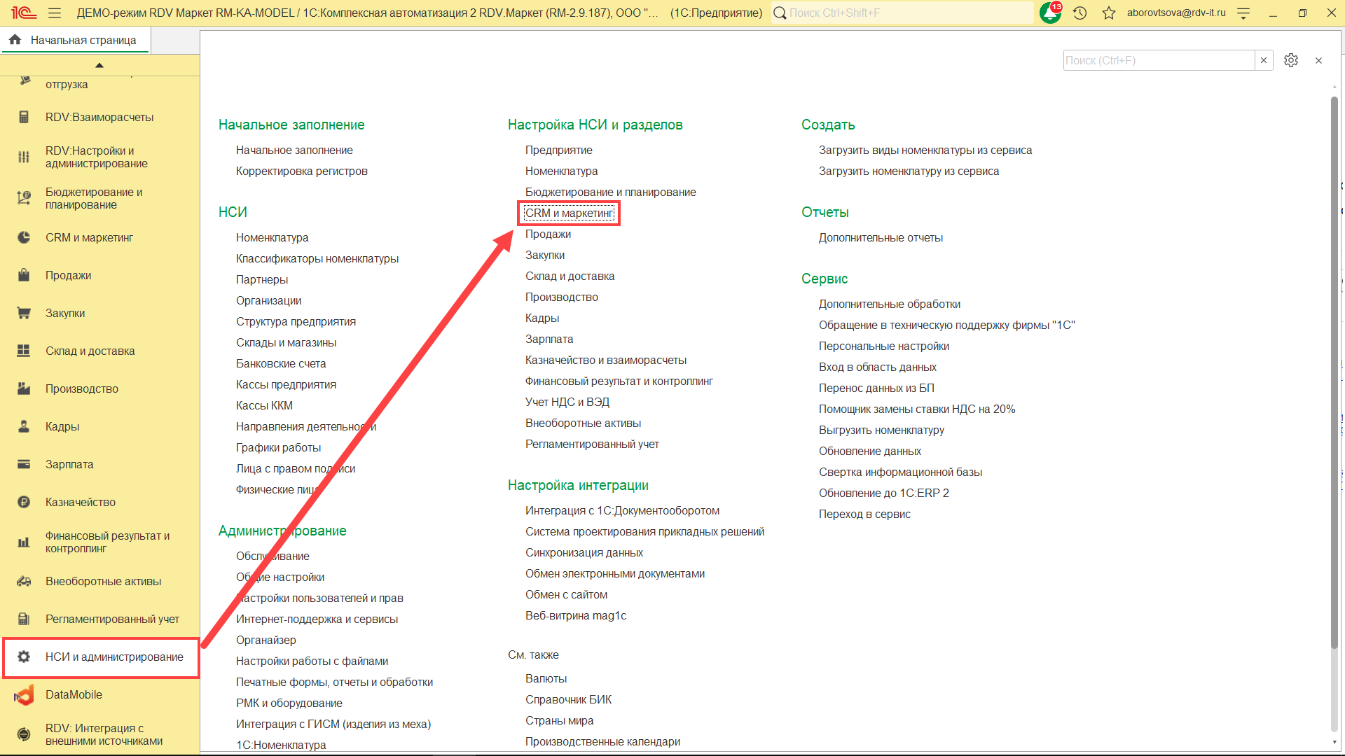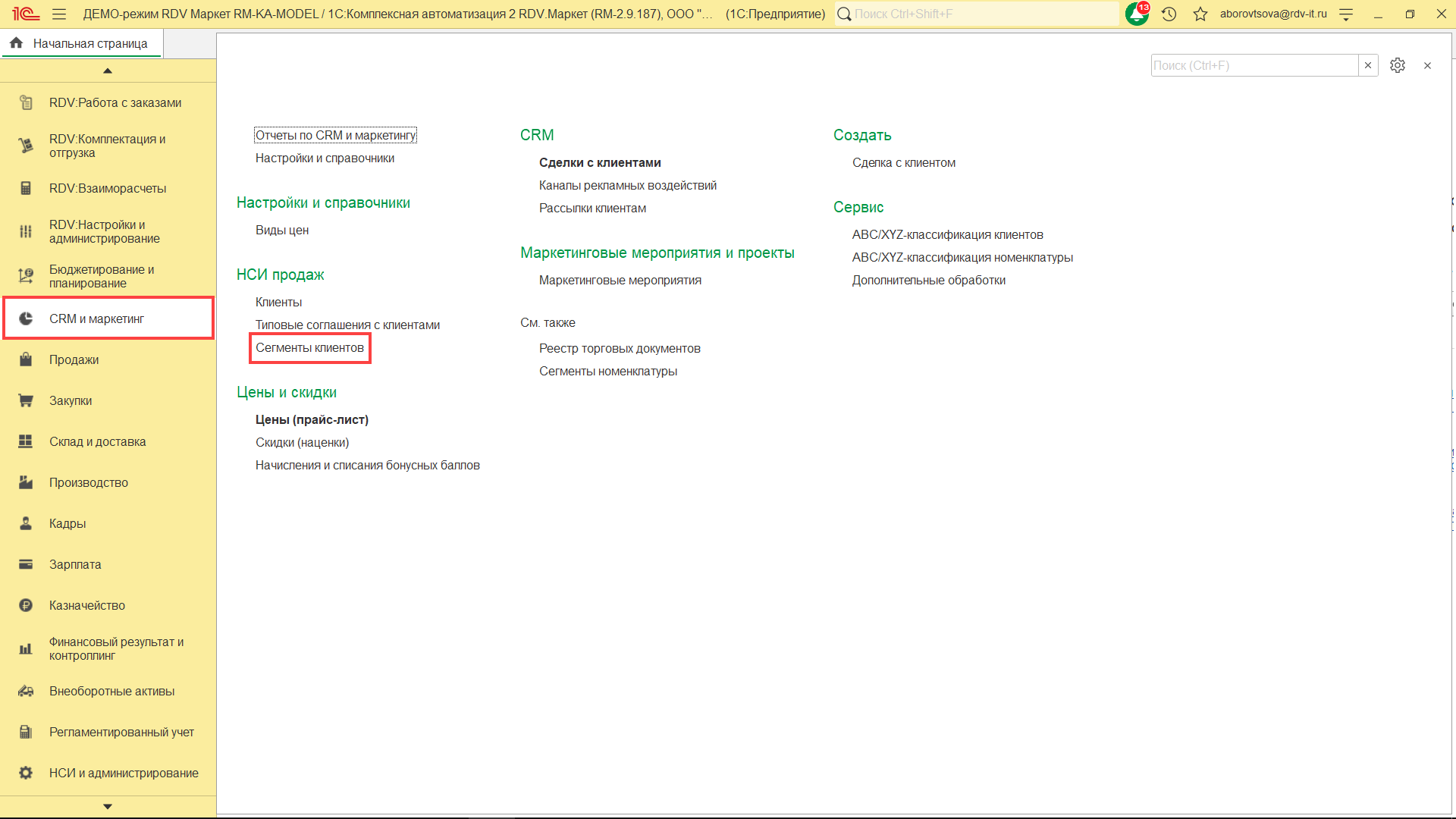 В программе предусмотрена возможность сегментации клиентской базы. Сегментация позволяет классифицировать партнеров по определенному набору правил. Для включения функциональной опции использования сегментов необходимо перейти в раздел "НСИ и администрирование" - "CRM и маркетинг".