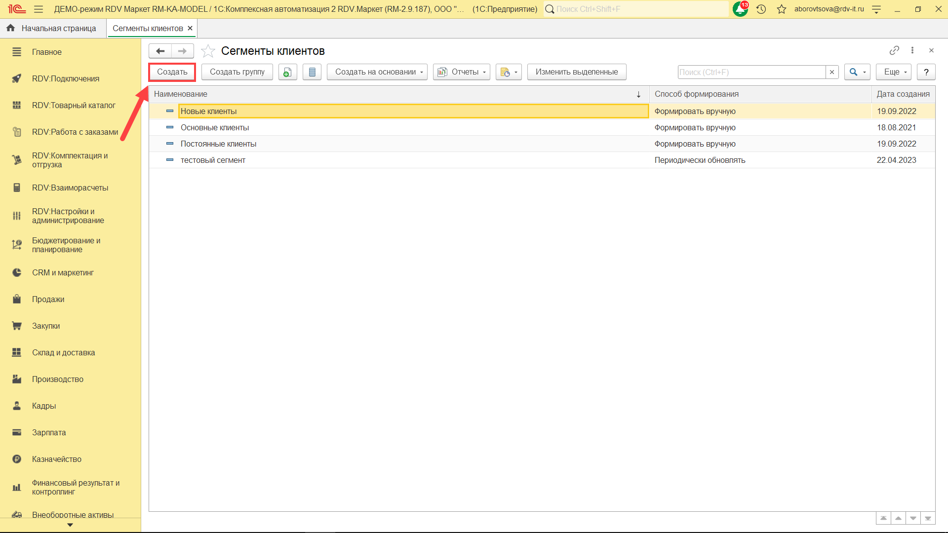 В открывшемся справочнике для создания нового сегмента необходимо нажать кнопку "Создать".