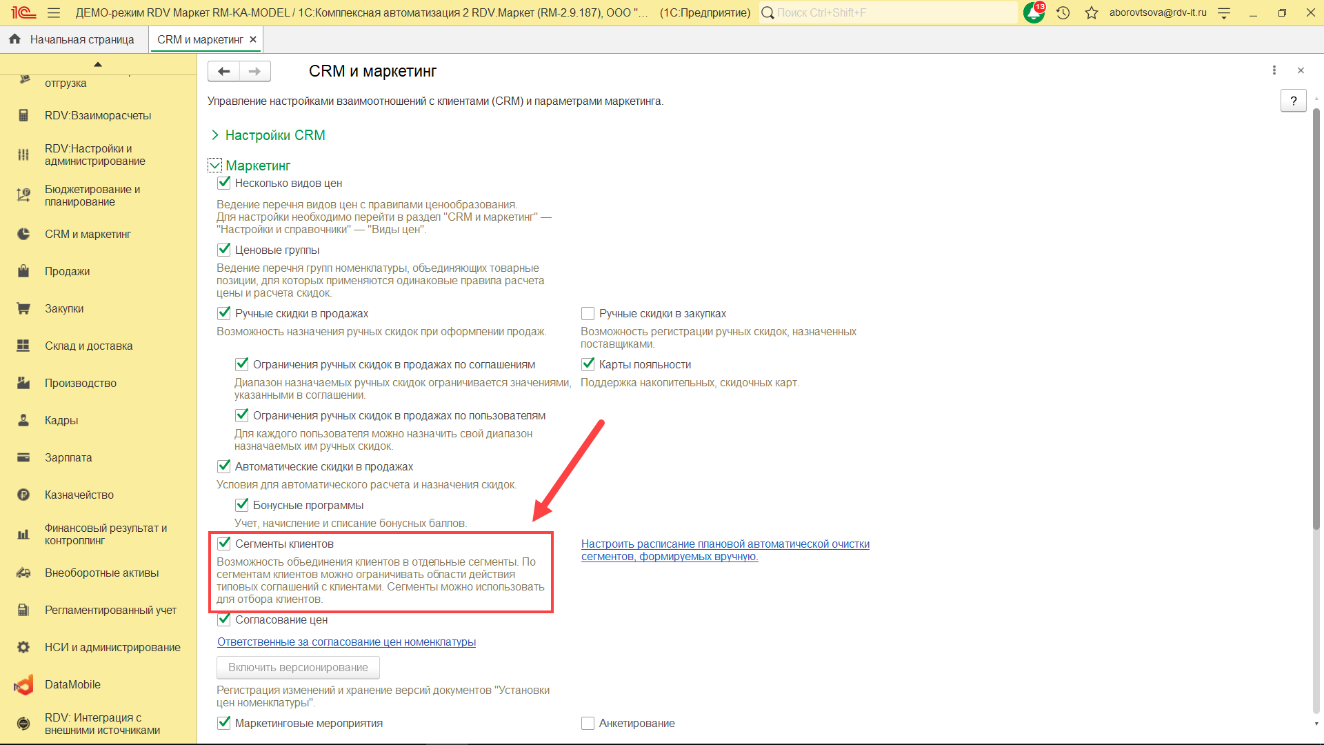В разделе "Маркетинг" необходимо установить флаг "Сегменты клиентов".