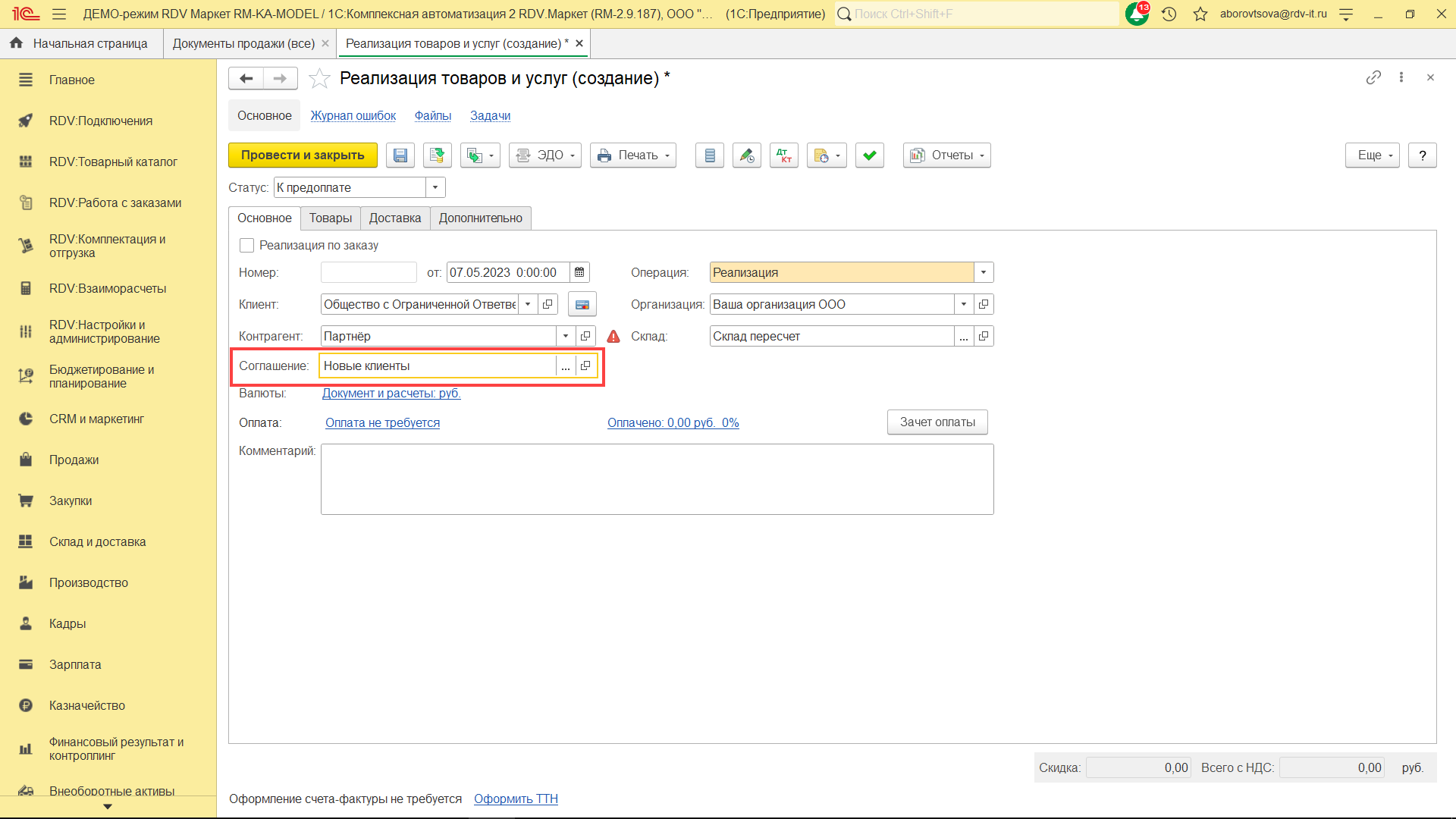 Таким образом в документах продажи, при выборе клиента включенного в указанный в соглашении сегмент, будет подставляться соответствующее типовое соглашение. Условия продаж, условия оплаты и прочие условия перенесутся в документ из соглашения.