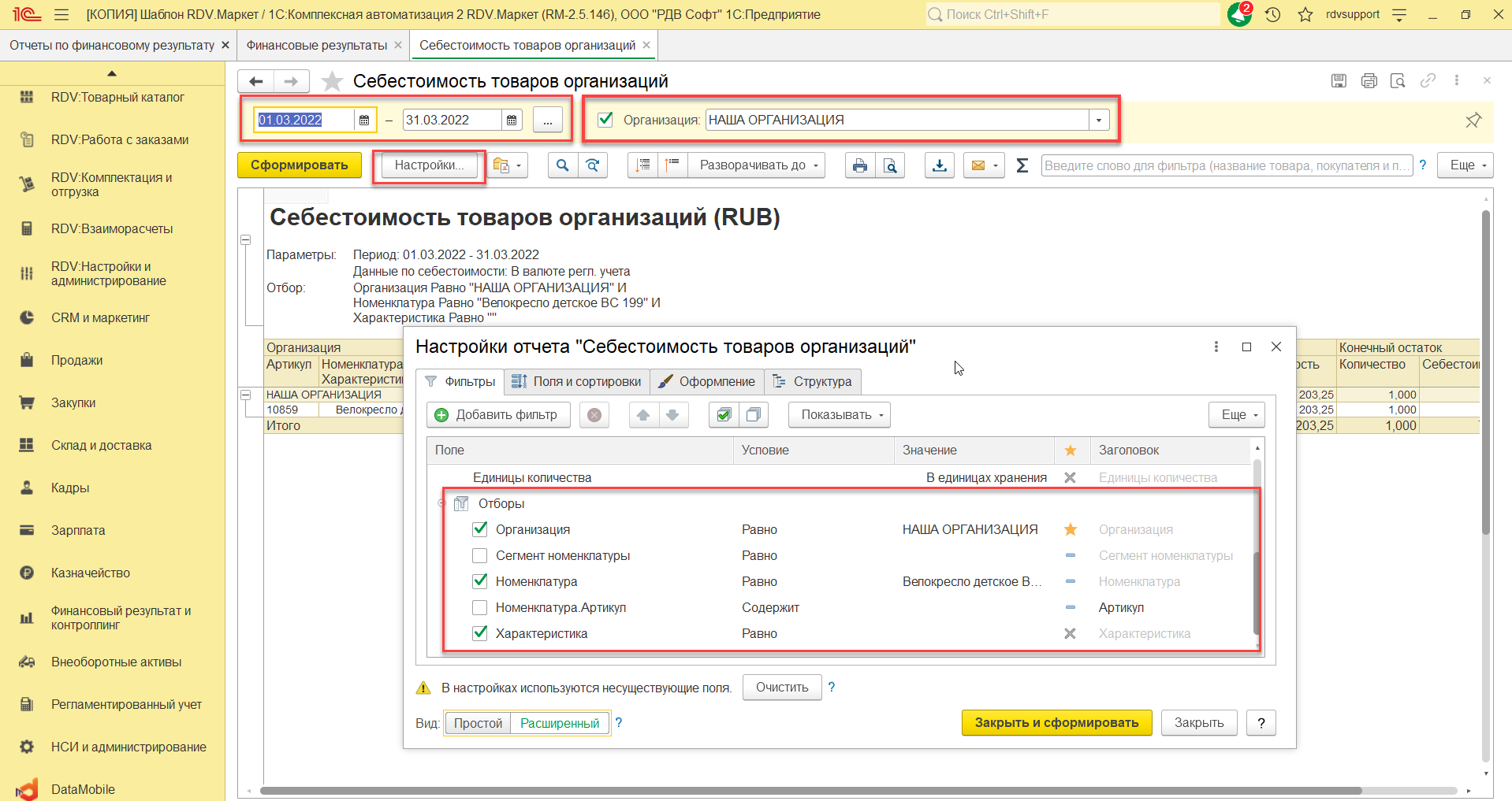 Перед формированием отчета можно указать период, организацию (если требуется сформировать отчет по одной из организаций). Дополнительно, в настройках отчета, можно установить необходимые отборы.