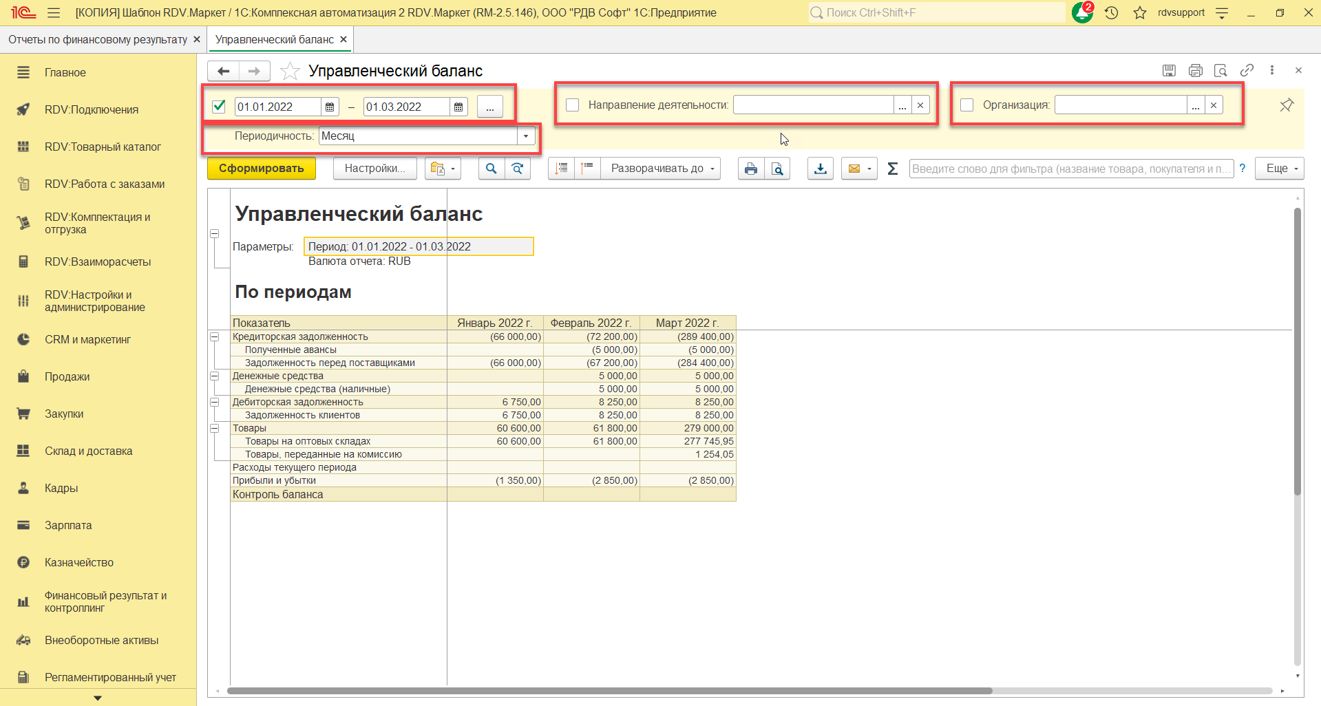 Раздел: Финансовый результат и контроллинг - Отчеты по финансовому результату – Управленческий баланс.
