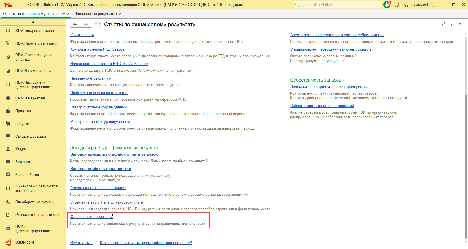 После выполнения регламентных операций по закрытию месяца следует проанализировать результаты деятельности. Для анализа результатов деятельности можем предложить следующие отчеты: Финансовый результат и контроллинг – Отчеты по финансовому результату.