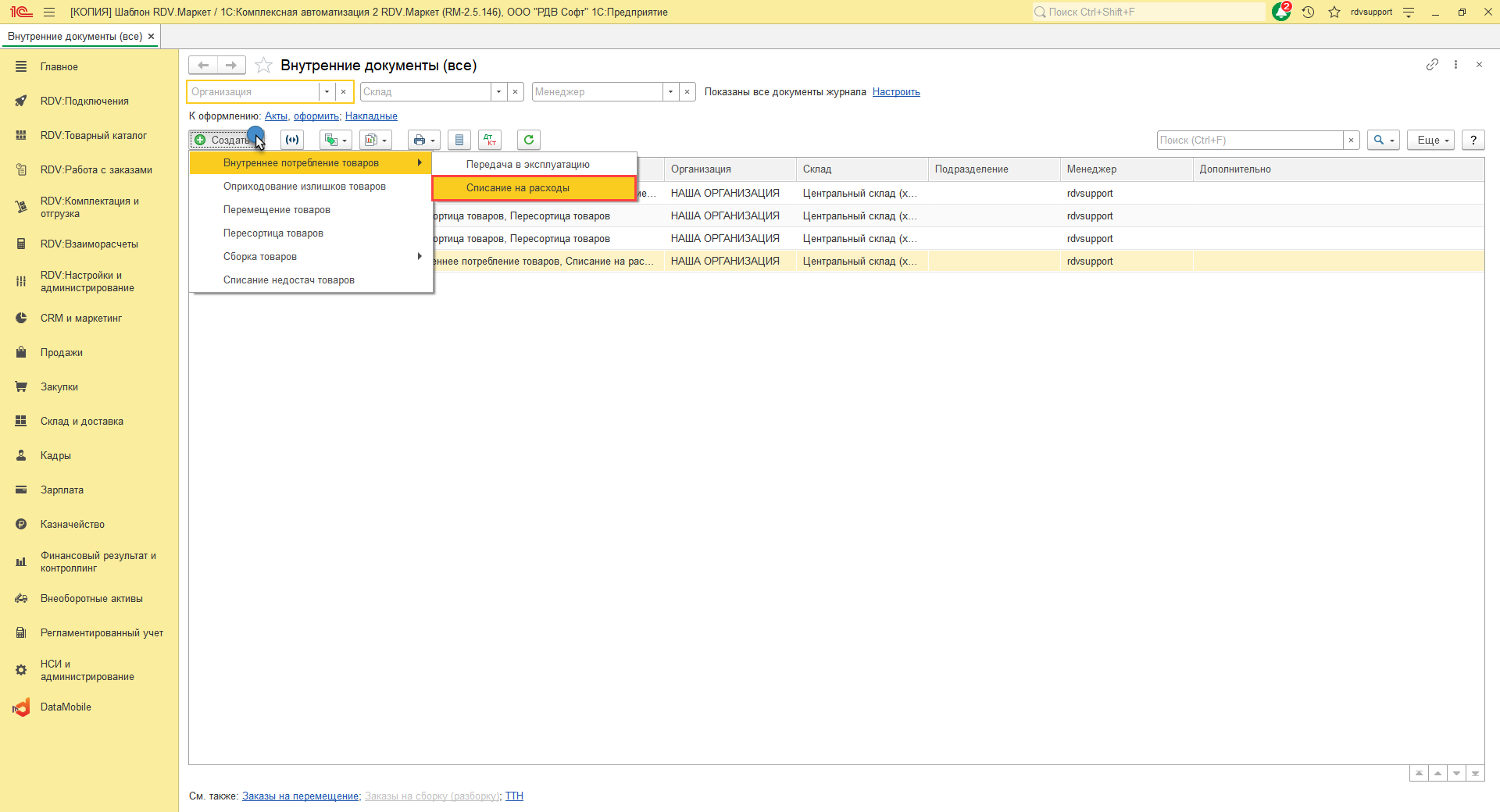 Для отражения списания ТМЦ (упаковка, материалы, а также малоценное оборудование с несущественной стоимостью, которое не учитывается в составе основных средств, и др.) на расходы предназначен документ Списание на расходы: Склад и доставка - Внутренние документы (все) - создать - Внутреннее потребление товаров - Списание на расходы.