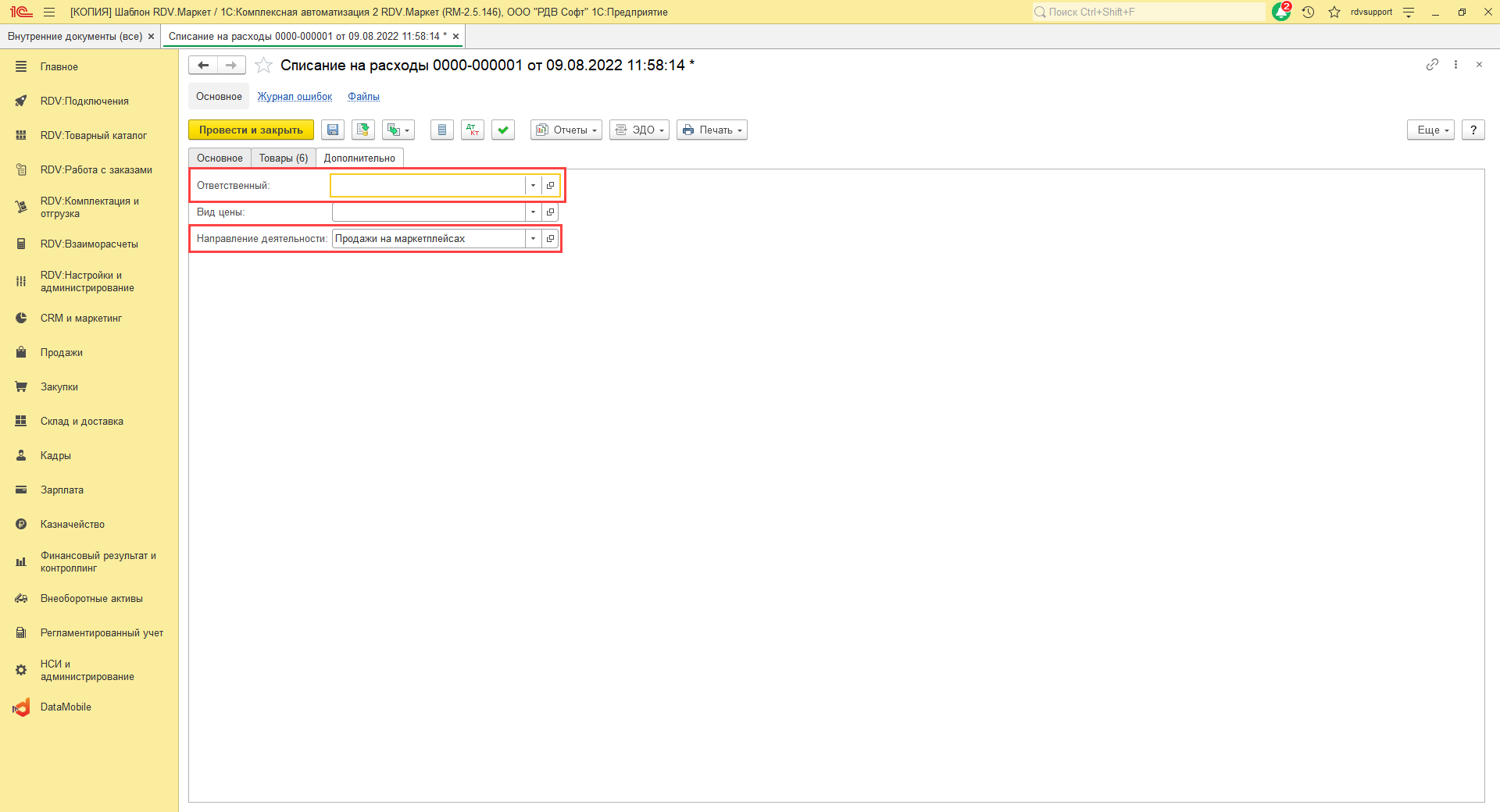На вкладке "Дополнительно" указать Ответственного и Направление деятельности (если используются). После этого документ следует Провести.