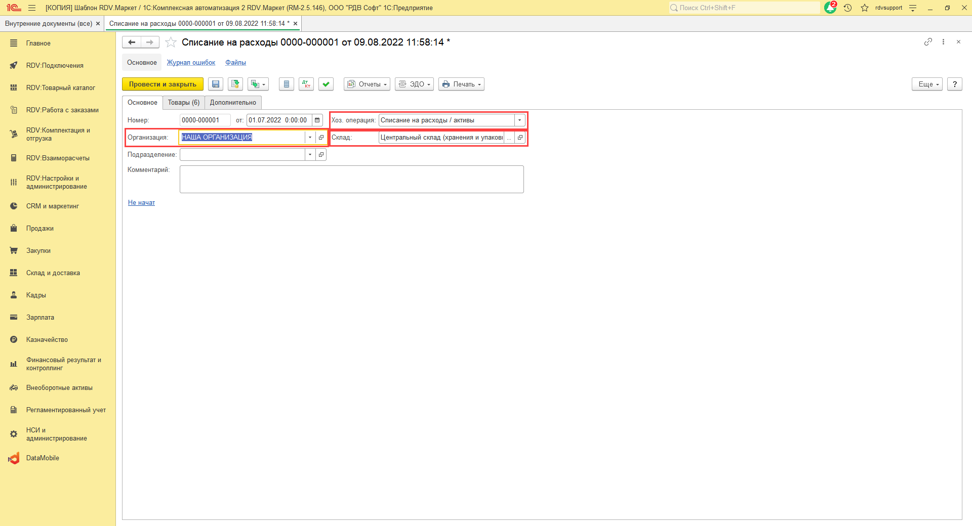 На вкладке "Основное" указать организацию, подразделение (если ведется учет в разрезе подразделений), хоз. операцию и склад.