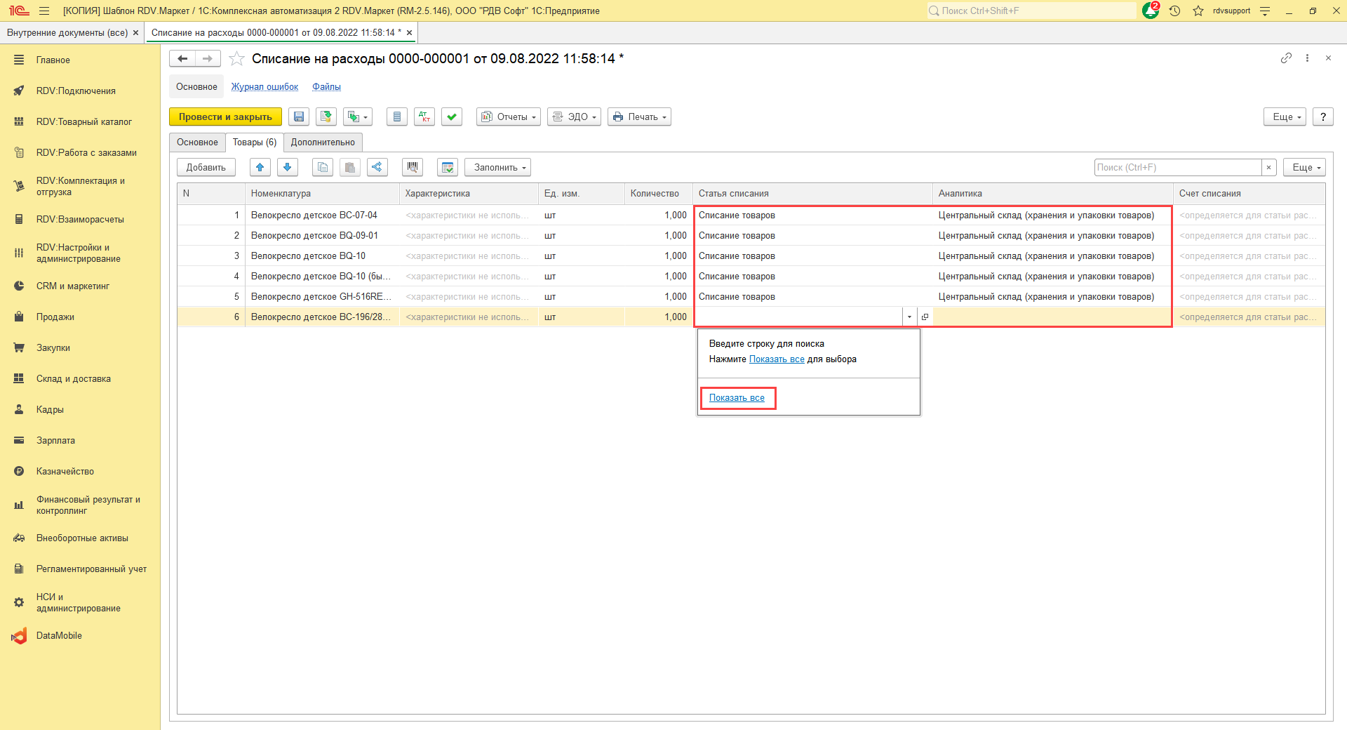 Вкладку "Товары" заполнить списываемыми товарами, для каждой строки указать (создать) Статью списания.